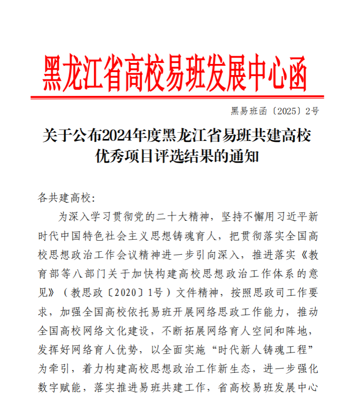 近日,由黑龙江省高校易班发展中心举办的2024年度黑龙江省易班共建高校优秀项目评选结果揭晓,我校在评选设置的6个奖项中全部获奖,获奖数量位居全省高校第一。我校获评省“优秀易班共建高校”,水利与土木工程学院《水木芳华,“易”同成长——基于易班立体化育人空间的一站式学生社区建设探索》获评省“高校优秀易班共建案例”,校易班工作站指导教师张书夺获评省“高校优秀易班指导教师”,农学院辅导员李镇童获评省“高校优...