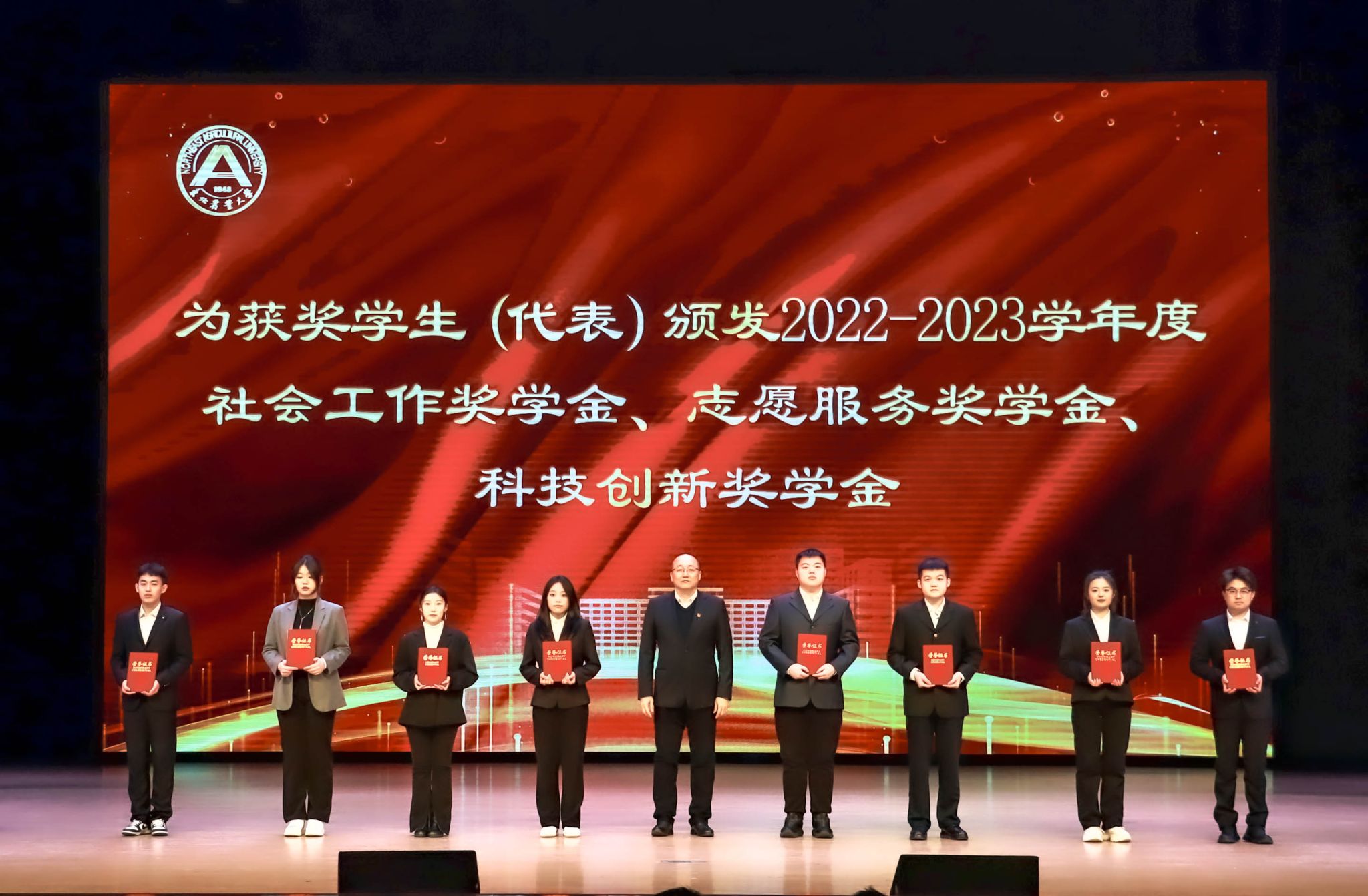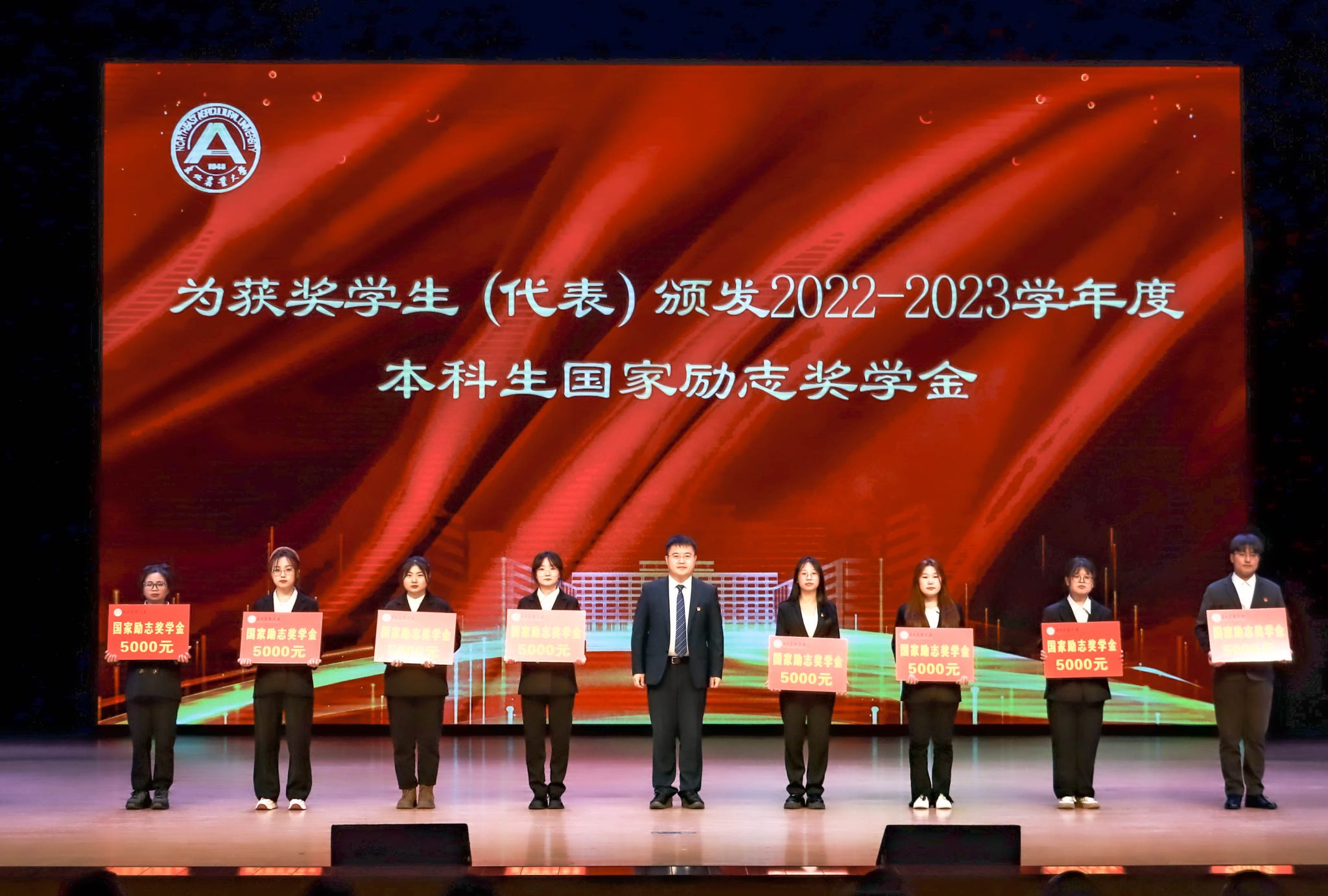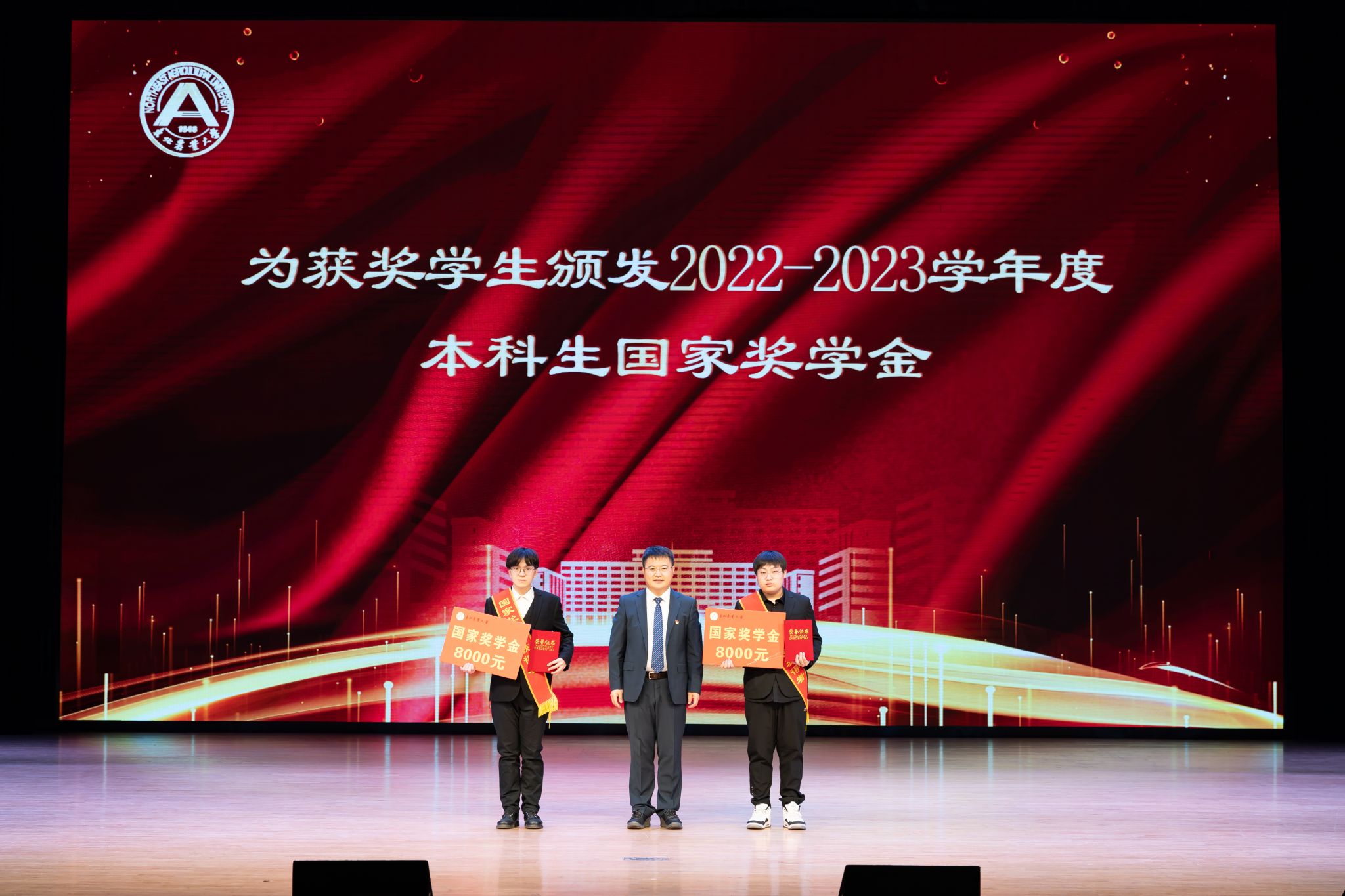 会上,于兴业宣读《关于颁发2022—2023学年度本科生国家奖学金、国家励志奖学金的决定》,并为获奖代表颁奖。