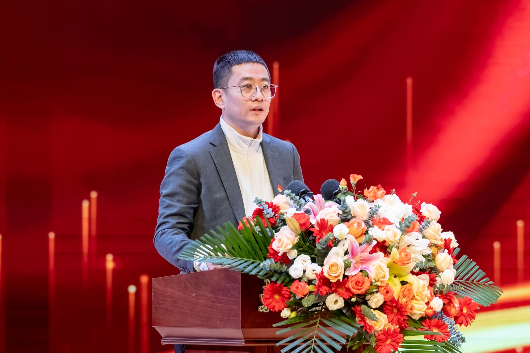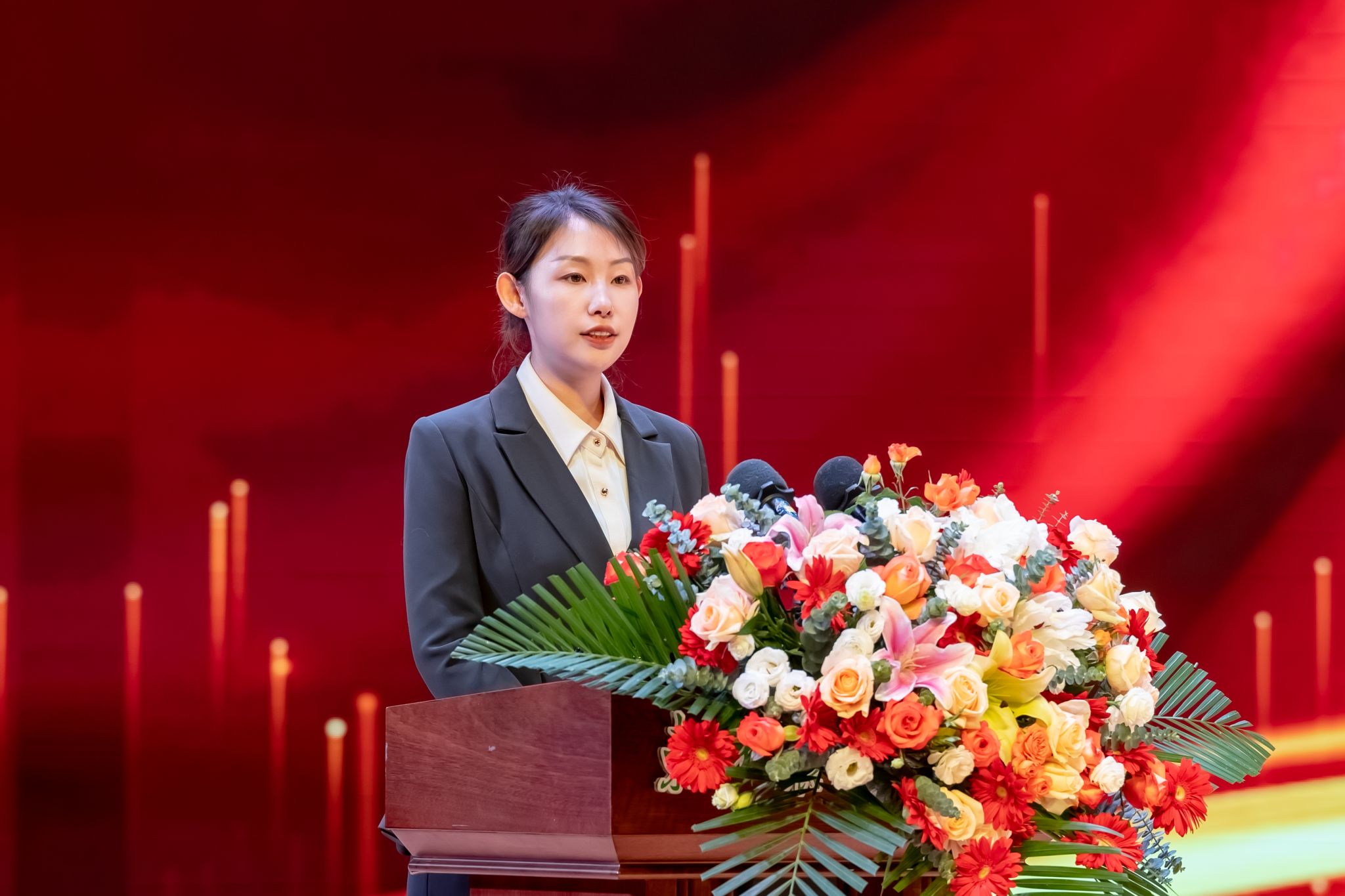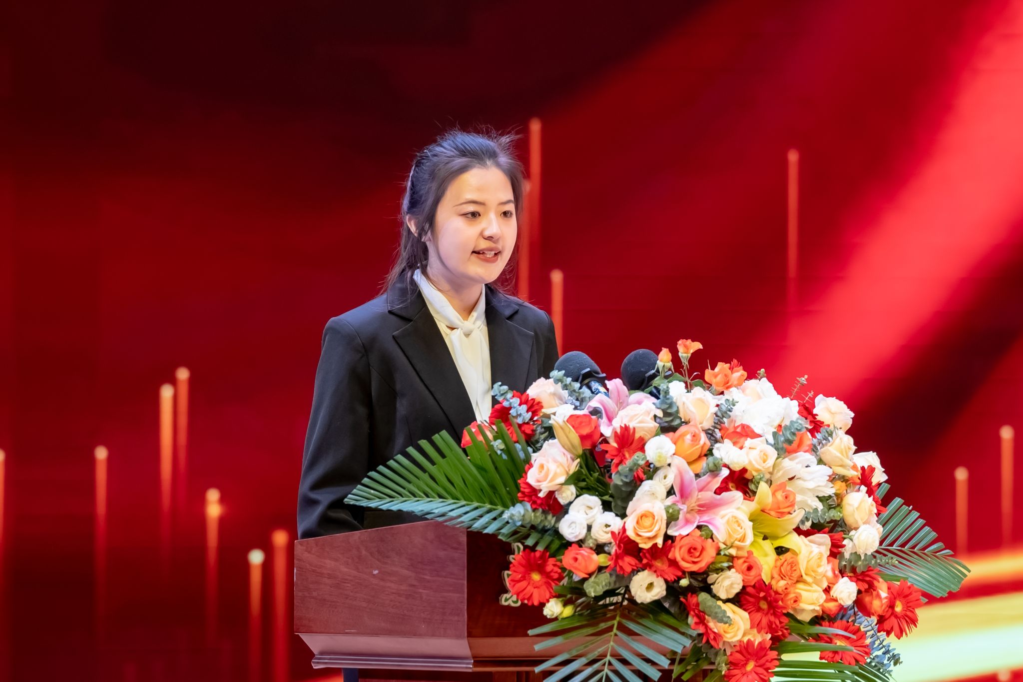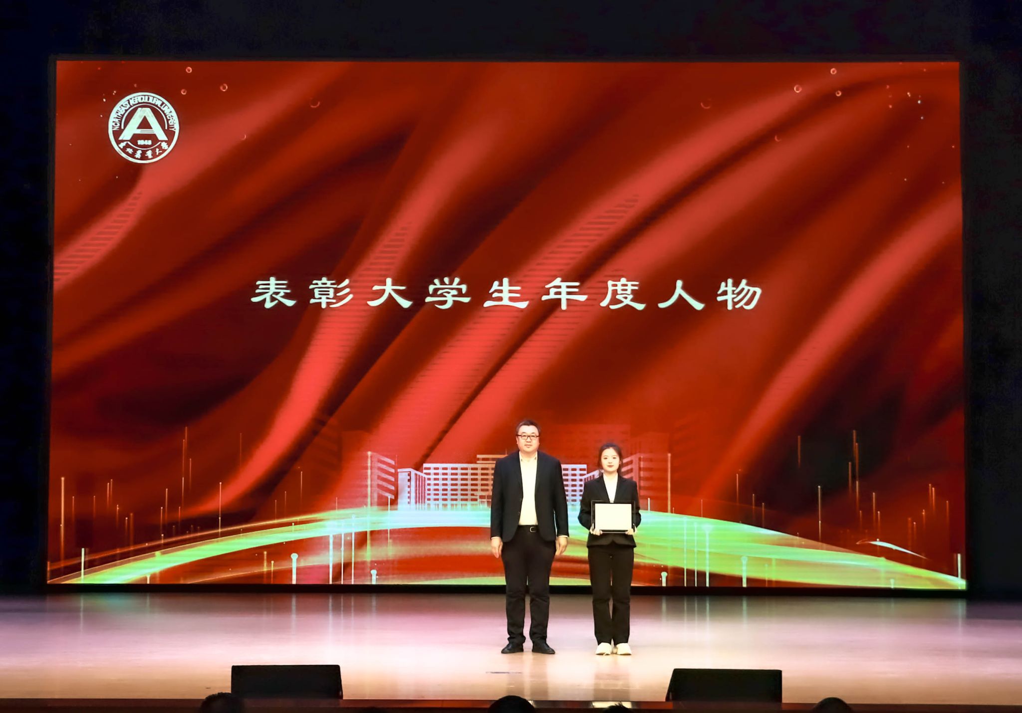 大学生年度人物、动医1981班李诺娃代表本科生受表彰学生发言。她从自身经历出发,以科学研究和社会实践两方面分享心得感悟,号召同学们永远保持对知识和科学研究的好奇心,注重全面发展,积极承担新时代大学生肩上的责任,充分利用大学生活续写人生新篇章。
