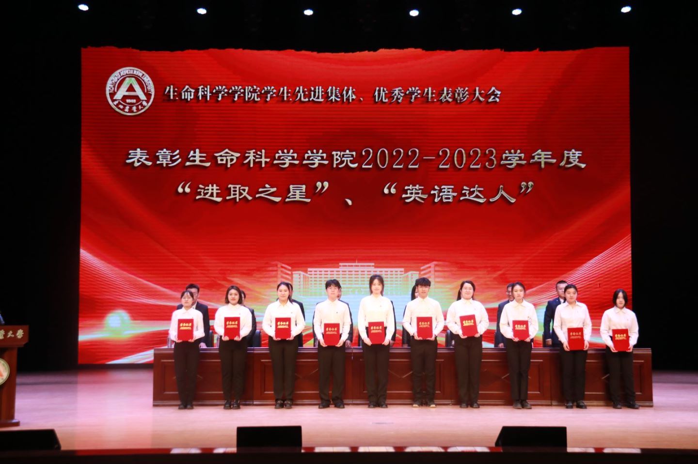 此外,生命科学学院为激励生命学子不言放弃、锐意进取,努力实现自我超越、自我突破,表彰了在2022—2023学年度学习成绩进步显著的同学并授予“进取之星”荣誉称号。同时,结合学科特点,鼓励学生在英语学习中持之以恒、勇攀高峰,表彰了在2022—2023学年度国家英语四六级考试中取得优异成绩的同学并授予“英语达人”荣誉称号。副处级辅导员刘文德宣读了《关于表彰生命科学学院2022-2023学年度进取之星、英语达人的决定》。与会领导共同为获奖集体和个人颁奖。