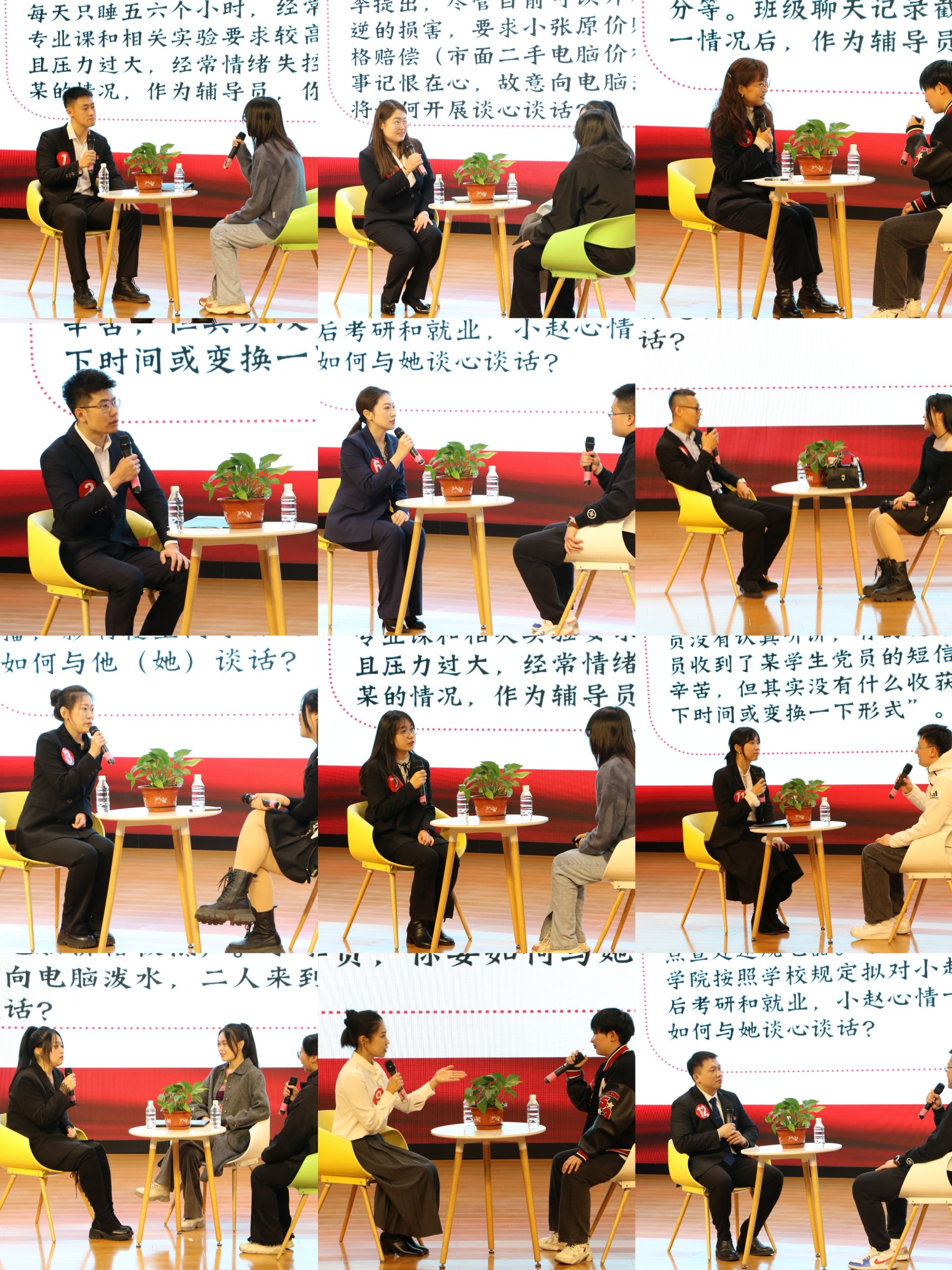 本次大赛对标省赛、国赛相关环节,经过初赛全员参加思政工作基础知识测试、复赛开展思政案例研讨两个环节的大比武、大练兵,共有来自8个学院的12位辅导员凭借优异表现从众多参赛辅导员中脱颖而出,进入最终环节。决赛采取谈心谈话的形式,主要考察辅导员对学生特点、学生成长成才规律的了解把握程度,对学生的教育引导能力和解决实际问题的能力。此环节以“情景再现”的形式,呈现参赛选手与助演学生交流谈心的场景。辅导员们围绕学生思想价值引领、学业困惑纾解、寝室人际纠纷、职业发展、心理危机等主题,与学生进行一对一、面对面的谈心。