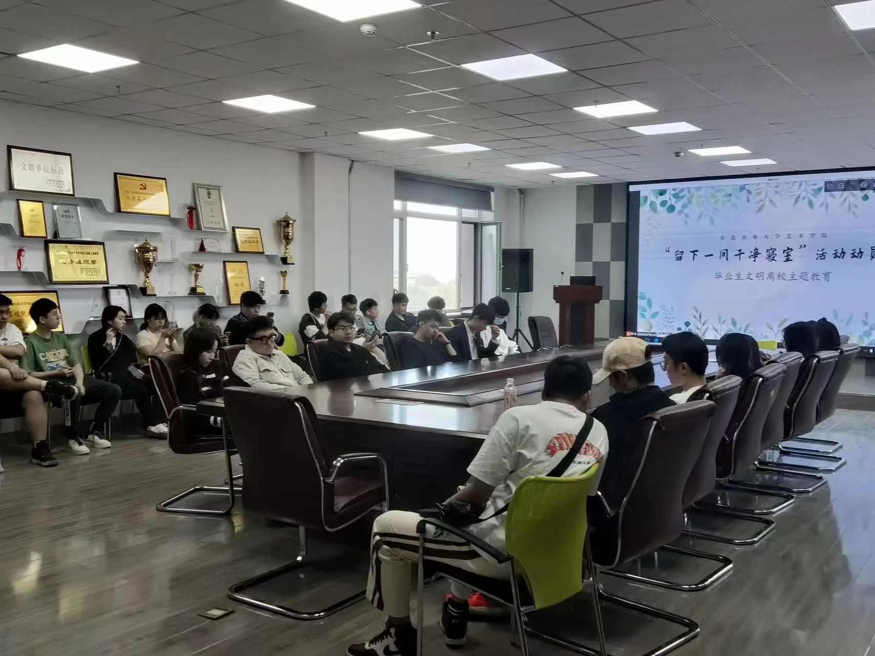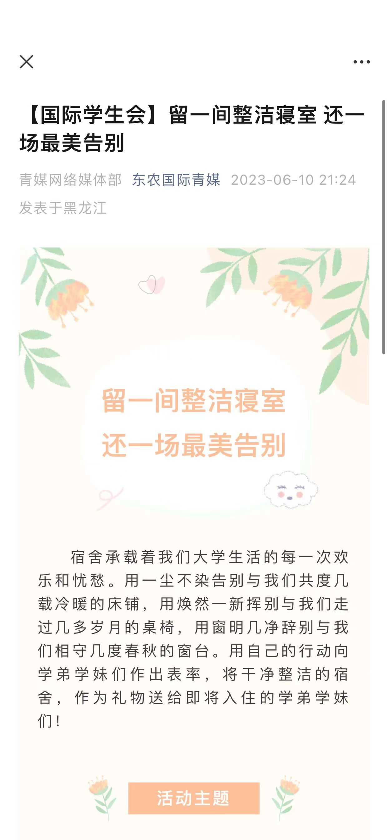 农学院组织毕业班学生对学院学习与发展中心等相关场所进行打扫和维护,清扫垃圾,摆放物品,擦洗污渍。通过劳动实践,锻炼了自己的劳动能力,也在临别之际用自己的青春和汗水为母校贡献出一份自己的力量,留下了最靓丽的风景。园艺园林学院在黑龙江省妇儿中心开展“立农为本,科技兴农”志愿服务活动,毕业生志愿者们通过农业知识宣讲、农业耕作体验等环节,向孩子们传播农村发展的新理念,传递绿色环保、科技促农的知识。艺术学院开展“留下一间干净寝室”活动动员会,毕业班辅导员张鲁冀老师强调宿舍自清是毕业离校的一项重要环节,也是毕业生昂扬精神风貌的体现和文明薪火相传的印证。公共管理与法学院开展青春“照”集令活动,组织毕业生开展了大学期间最后一次义务劳动,引导毕业生要弘扬劳动精神,感悟劳动与幸福的意义。电气与信息学院倡导毕业生在离校前进行寝室内务整理,在离校前将寝室恢复到大一入学时的状态,进行寝室合影留念,为学院在校生做出榜样和优秀传承。组织学院毕业班学生党员在毕业离校前开展公益劳动,清理场地,并亲手种上绿植,以此方式寄托对母校的热爱和怀念,同时培养毕业生党员吃苦耐劳和服务社会的优良品质。国际文化教育学院号召毕业生发扬劳动精神,辅导员录制创意小视频并召开年级会议,教育学生文明离校,留一间整洁宿舍,还一场最美告别。