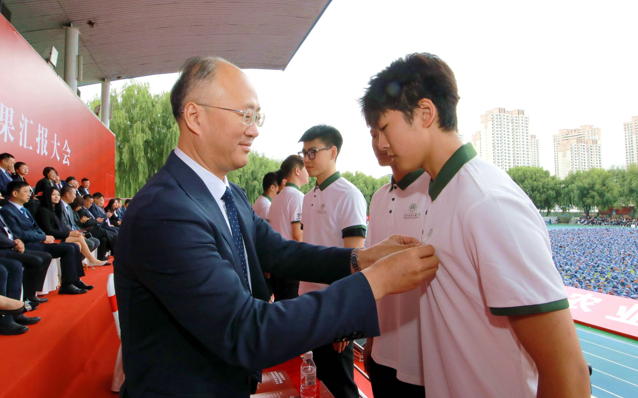 典礼上,校领导为新生代表佩戴校徽。每一枚校徽,都镌刻着东北农业大学深厚的文化底蕴和辉煌的历史成就。这一刻,不仅标志着新生们从此与东农“血脉相连”,更意味着他们将以实际行动践行东农人的初心与使命,把青春奋斗融入党和人民事业,向着奋进之路、逐梦之旅出发。