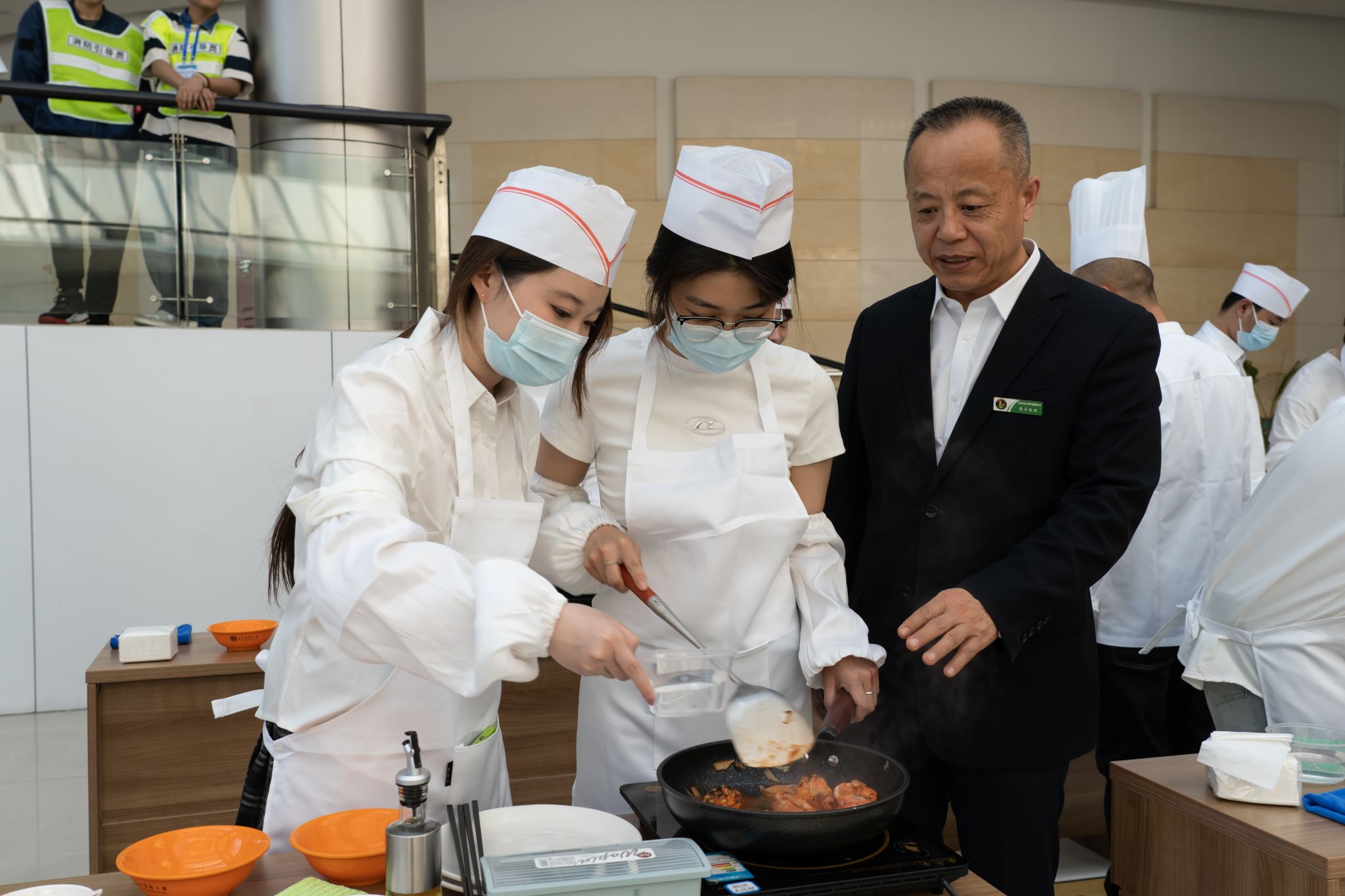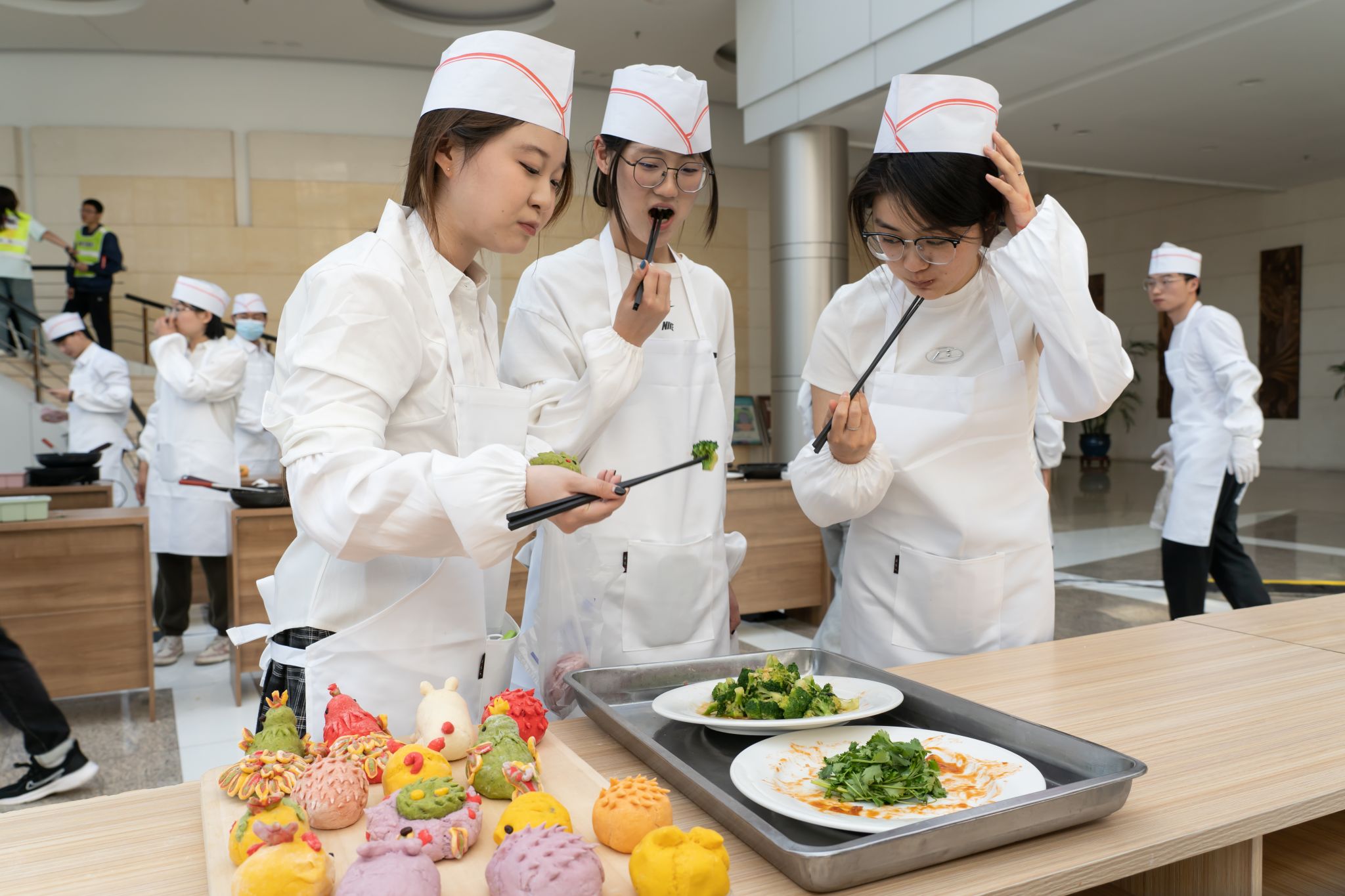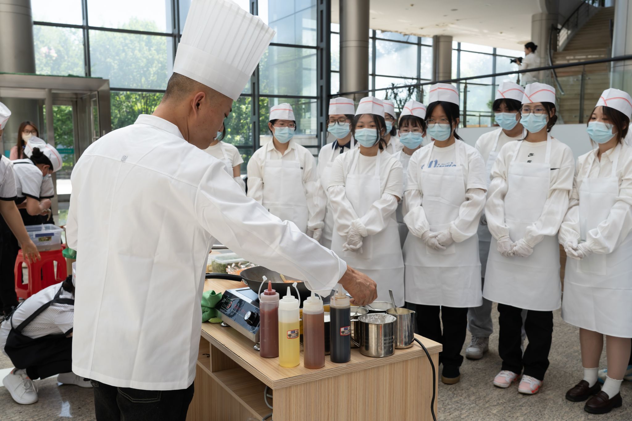 学生第四餐厅厨师郑国锋向同学们示范了油焖大虾、蒜蓉西兰花两道菜品的制作过程。面点师王雅玲、韩海燕现场展示了特色面点的制作工艺。
