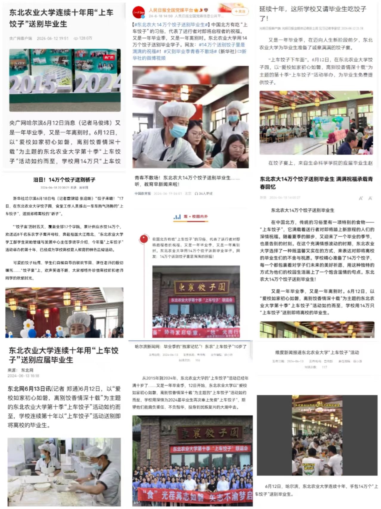 据悉,2015年,东北农业大学成为全省首家开展毕业生“上车饺子”活动的高校,如今也走到了第十个年头。近十年“上车饺子”已送别近几万名毕业生带着对母校的眷恋和对同窗的不舍奔赴大江南北,在祖国大地上书写东农故事,在各行各业贡献青春力量。我们看不见时间,但可以看见时间的力量。离别的风拂过一届又一届学子的面庞,饱含爱意的饺子、辅导员的殷切话语、同窗间的依依不舍……这是每年东农毕业季最温情的画面。十年来,“上车饺子”活动已经打造成为东北农业大学离校育人特色品牌活动,是响应“爱校如家,当好主人翁”精神号召的具体举措。弦歌不辍,薪火相传。学校不断打响“上车饺子”东农名片,号召东农毕业生秉持东农自信,耕读修身,为农业强国贡献新时代东农人的智慧和力量。