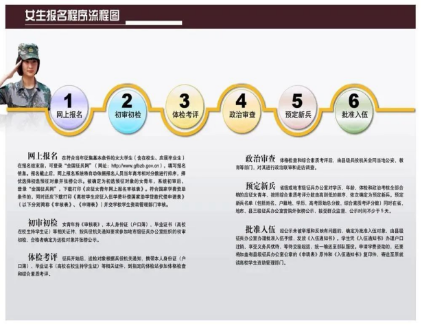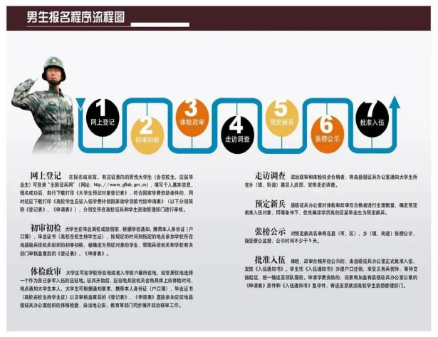①兵役登记→②网上报名→③初审初检→④体检政考→⑤走访调查→⑥预定新兵→⑦