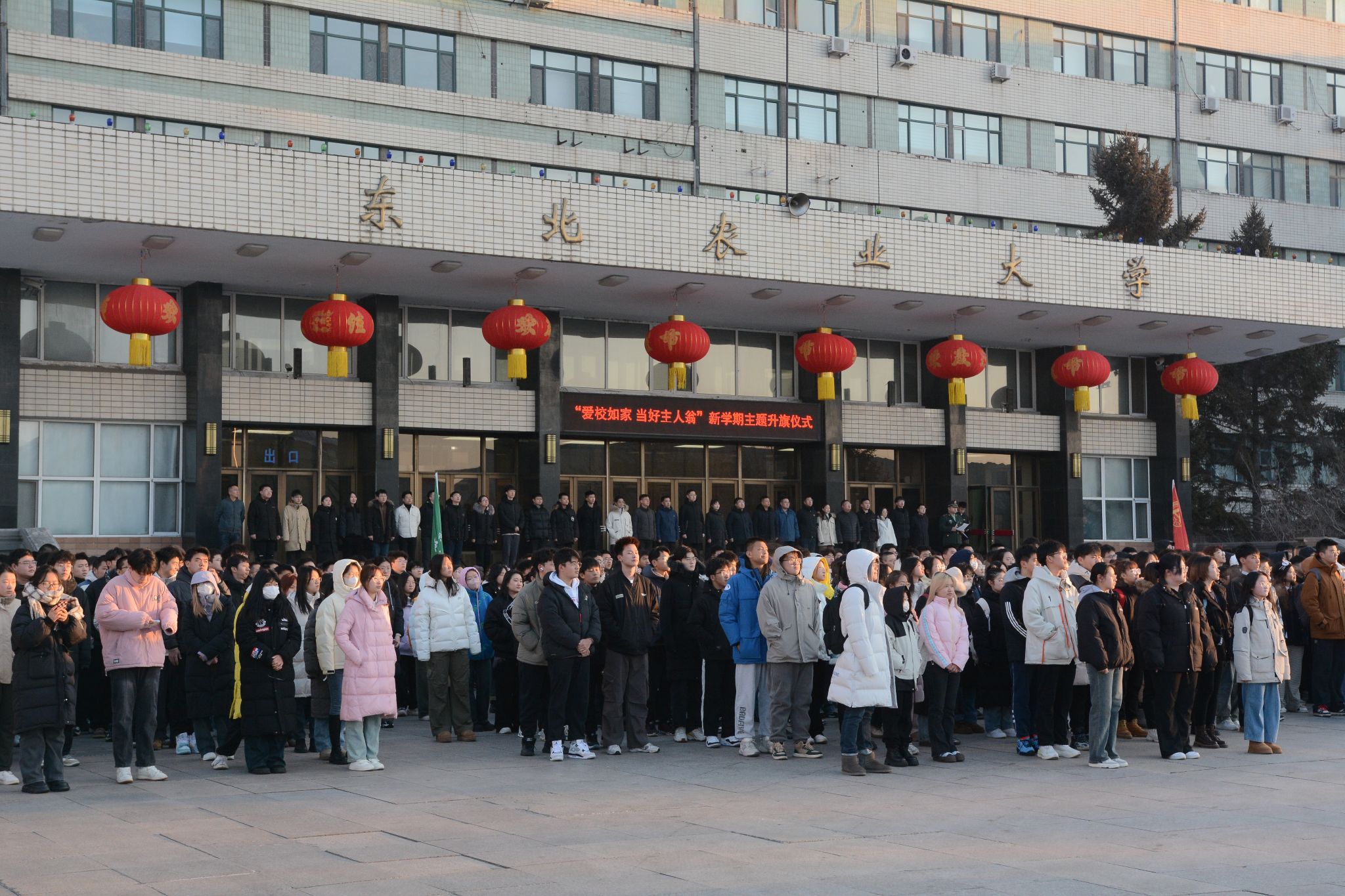 3月4日清晨,东北农业大学在主楼广场隆重举行“爱校如家 当好主人翁”2024年春季学期主题升国旗仪式。学生工作部、校团委、各学院党委副书记、辅导员及学生代表1000余人参加仪式,仪式由学生工作部副部长刘双奇主持。