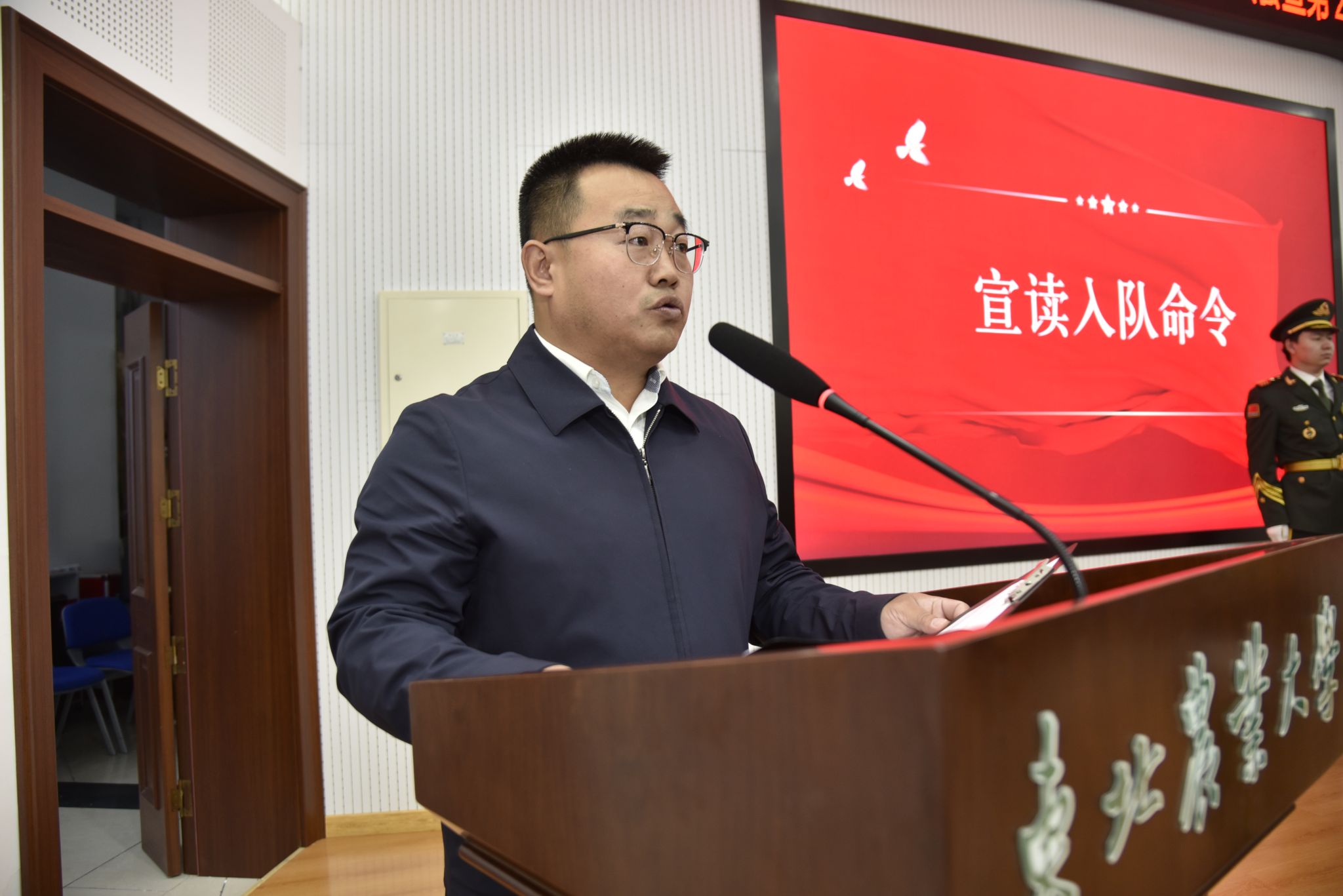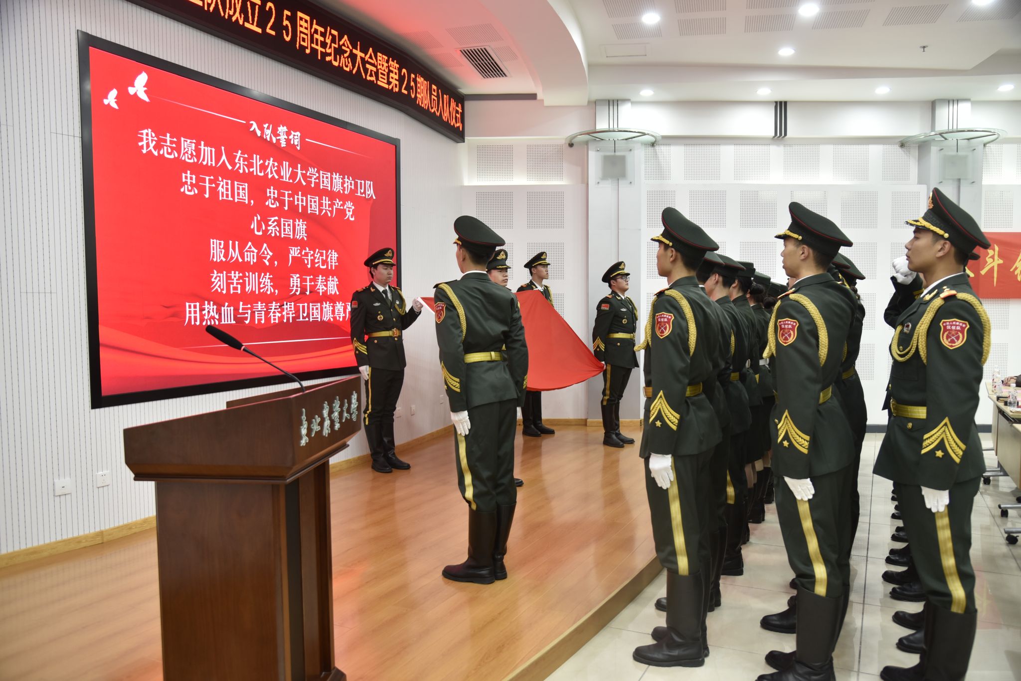 学生工作部(武装部)副部长刘双奇宣读了《关于批准于瀛等三十名同学为东北农业大学国旗护卫队队员的命令》,第25期新队员在国旗护卫队队长赵俊哲的领誓下庄严宣誓,国旗护卫队副队长霍志璞向新队员代表江智坤同学授予了国旗。