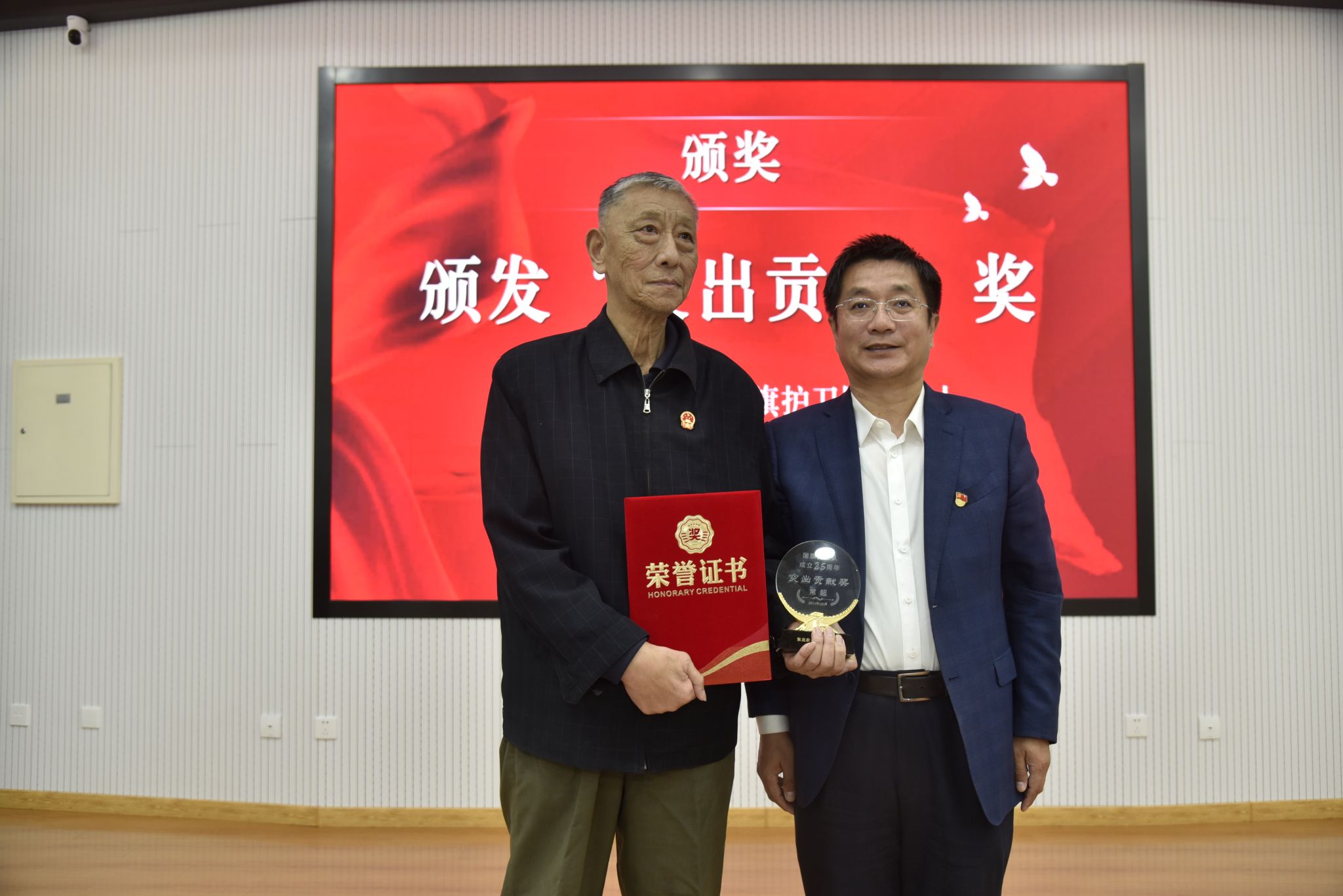 贺景平向常超同志颁发国旗护卫队“突出贡献奖”
