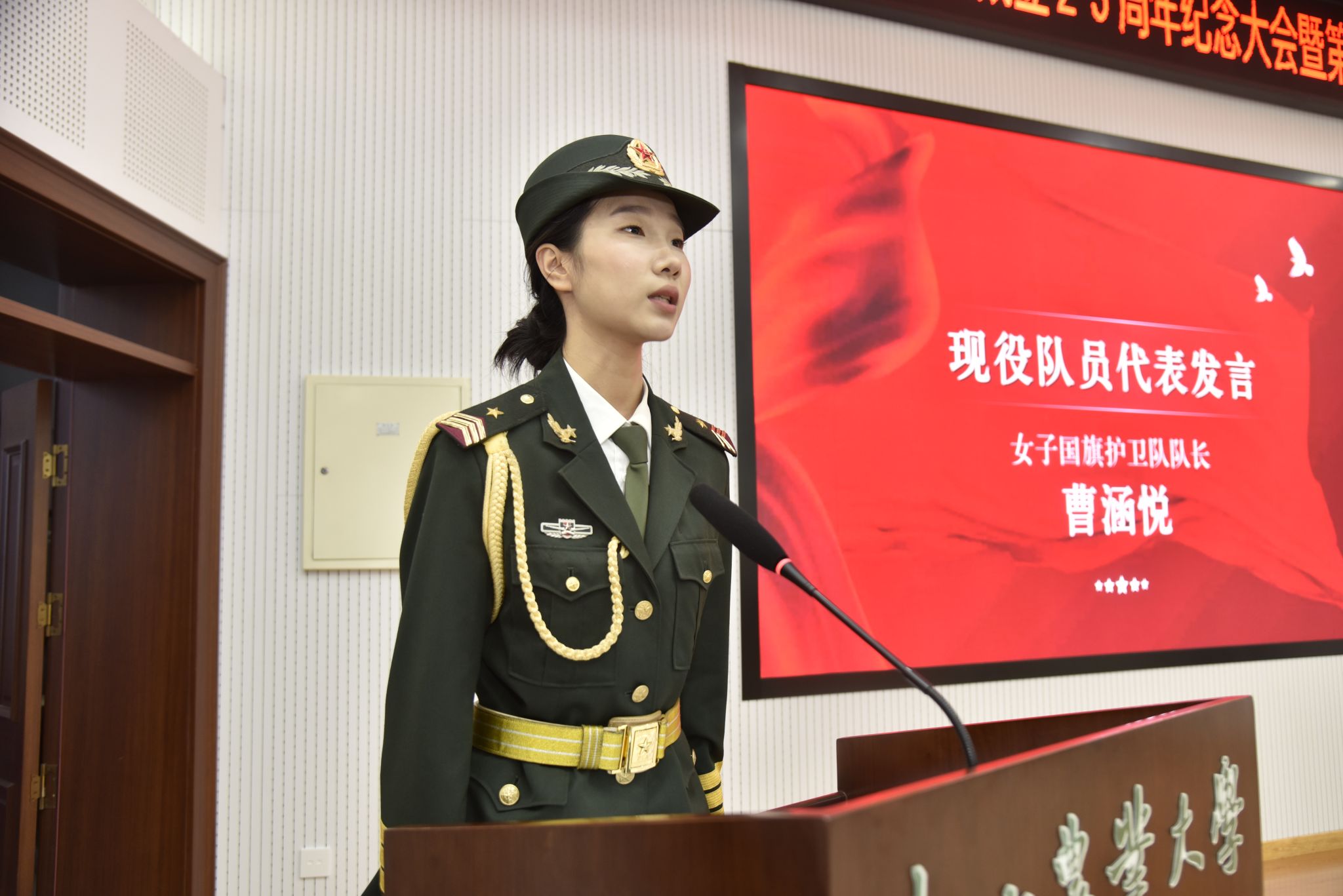 现役队员代表、女子国旗护卫队队长曹涵悦同学在发言中讲到,成为一名国旗护卫队队员,不仅是一份荣耀,更是一份沉甸甸的责任,每一次升旗、每一次降旗,都是对祖国的深情告白。