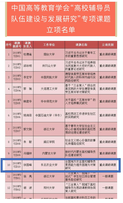 近日,中国高等教育学会公布“高校辅导员队伍建设与发展研究”专项课题立项名单,由我校牵头,联合吉林农业大学、四川农业大学、甘肃农业大学共同申报的《全国地方农业高校辅导员素质能力提升困境与对策研究》课题入选十项重点调研课题,这是我校学生思想政治工作课题首次入选。