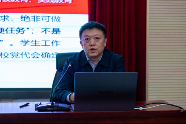 刘晓峰对当前学生工作的新形势、新要求、新机遇、新挑战进行了深入分析,并提出八点要求。一要谋长远,锚定战略方向,明确价值遵循。以《教育强国建设规划纲要(2024-2035年)》为战略蓝图,紧扣培养担当民族复兴大任的时代新人核心使命,构建以新时代立德树人工程为统领的实施体系。二要打基础,筑牢育人根基,夯实发展底盘。从思想教育、学风建设、学生组织、辅导员队伍建设等方面加强教育引导,强化学生自我管理、自我服务能力。开展辅导员职业能力培训,打造一支政治强、业务精、作风正的学工铁军。三要建制度,完善制度体系,提升管理效能。以“废改立”为抓手,填补制度盲区,确保制度与时俱进,构建科学规范、运行有效的制度体系,实现制度效能向育人实效转化。四要优机制,坚持系统观念,贯通协同机制。以“大学工”格局贯通部门协同机制,与各学院携手打造“上下联动、同题共答”的工作局面,为学校构建“大思政”育人格局厚植根基、积蓄力量,推动立德树人目标任务落地见效。五要强管理,聚焦主责主业,守牢安全底线。加强学风管理,抓考风、促学风,营造风清气正的学习环境;强化日常管理,以“平安校园”建设为目标,完善突发事件应急预案,防范化解各类风险隐患。六要促改革,突出问题导向,勇于实践创新。围绕学生综合评价改革,构建“五育融合”评价体系;完善辅导员队伍的考核指标体系建设,突出指导学生成效、创新成果、安全稳定等育人实效评价标准;加强前瞻性谋划,探索以“人工智能和大数据”为驱动的学生发展预警与支持系统建设,实现从被动管理向主动服务的转型升级。七要转作风,站稳人民立场,强化履职尽责。以学生为中心重塑学生工作价值导向。从“管理学生”转向“成就学生”,建立“首问负责制”和“限时办结制”,对学生诉求做到“即时响应、高效解决”。八要抓落实,拧紧责任链条,确保工作实效。建立目标设定、任务分解、督办落实、考核评价等多环节构建全链条责任体系,通过清单化推进、穿透式督查,推动决策部署落地见效。