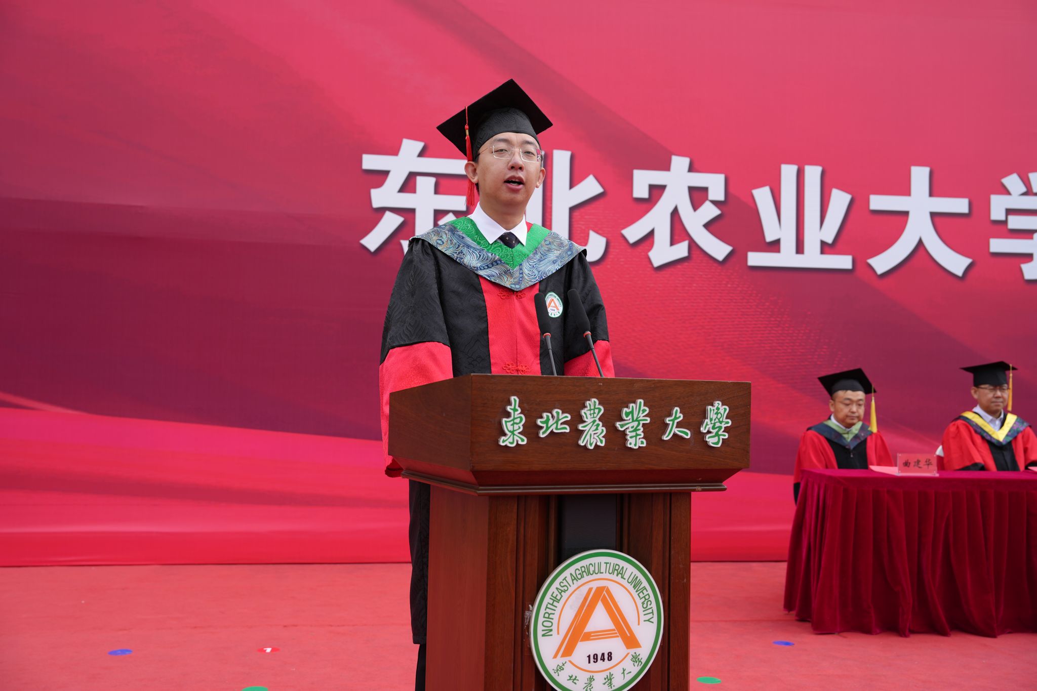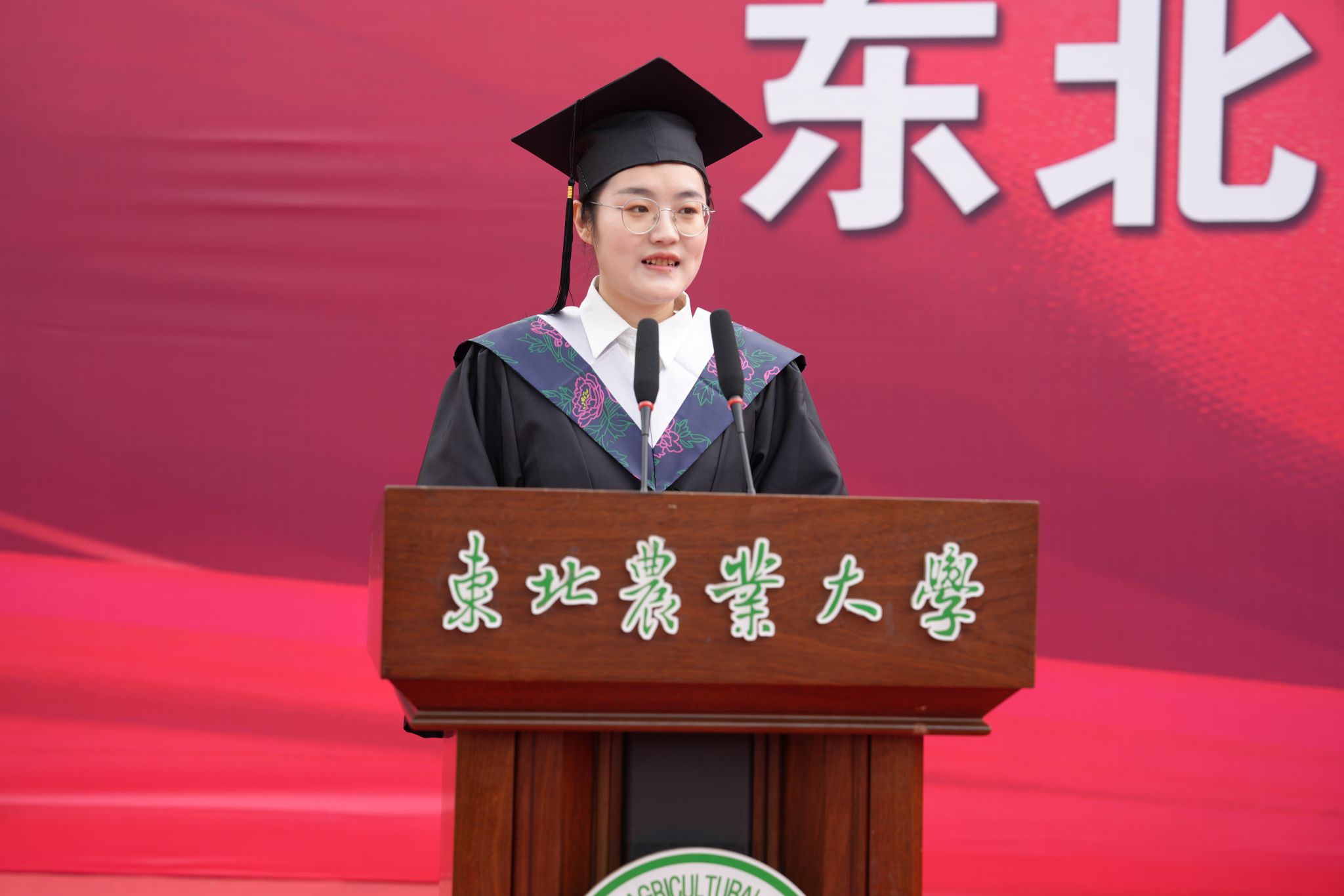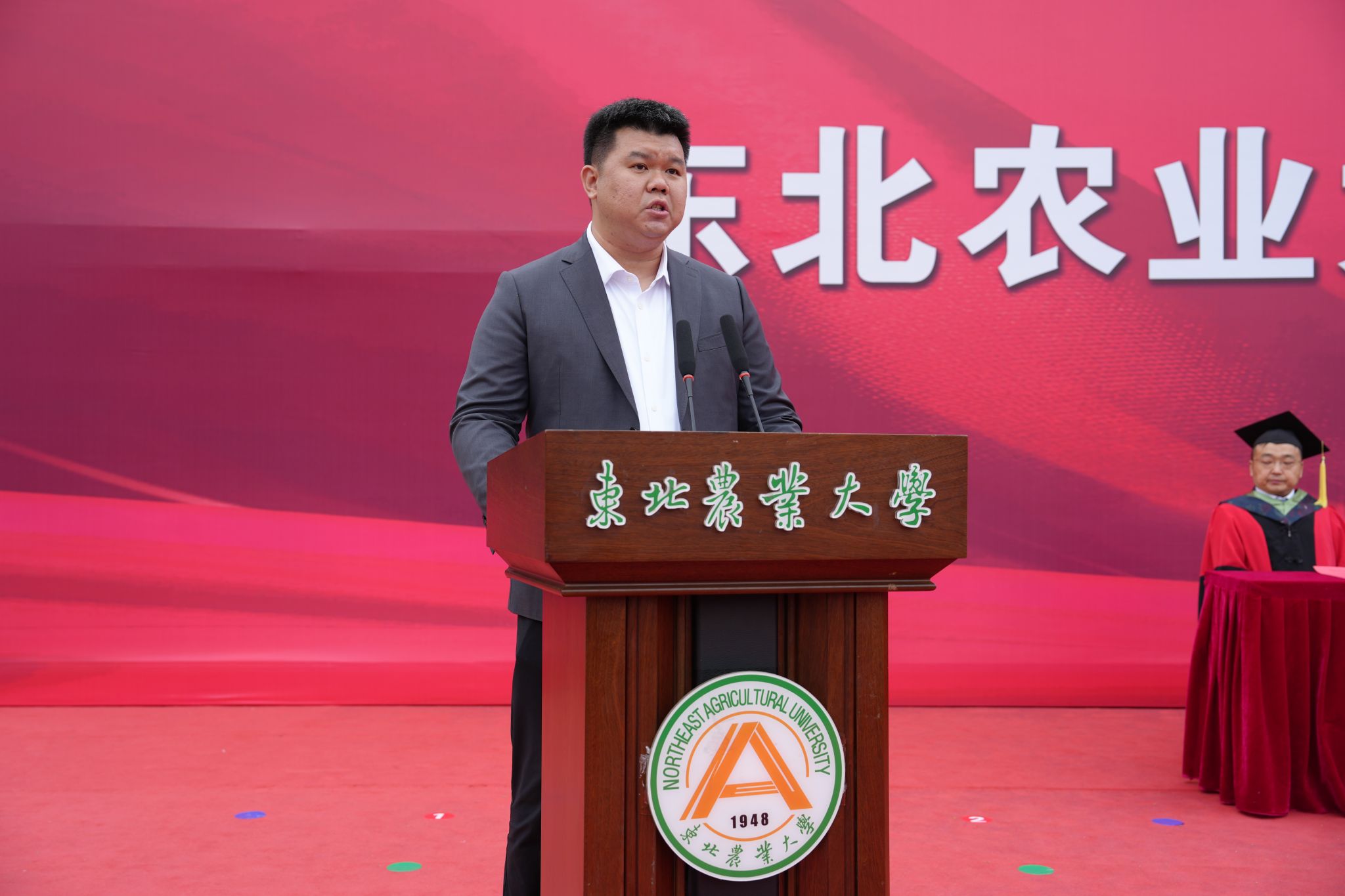 毕业生家长代表宋鸿欲女士代表全体毕业生家长,感谢学校提供的优质教育资源和广阔发展平台,让每一位东农学子都能成长为祖国需要的栋梁之材。经济管理学院会计系2009届本科毕业生、平安银行哈尔滨分行营业部总经理高浩然作为校友代表,与毕业生们分享了在东农求学的成长故事,并结合自身经历,鼓励大家要厚积薄发、行稳致远,一步一个脚印努力实现自己的人生价值。