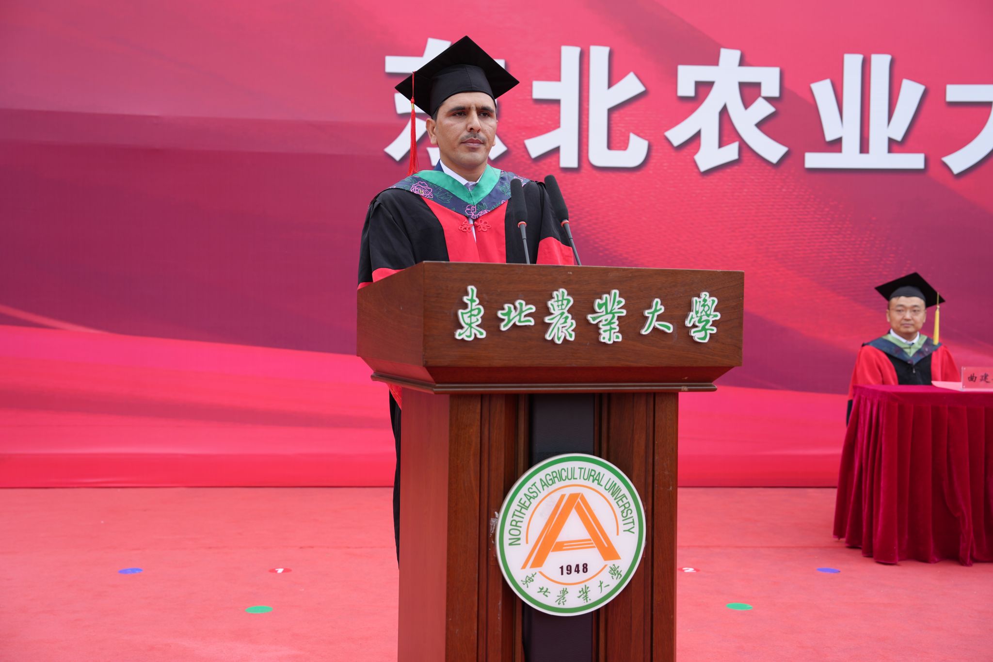 毕业典礼在雄壮嘹亮的国歌中拉开帷幕,在宣读2025届毕业生学位授予名单后,本科毕业生代表、资源与环境学院朱丽雅回顾了四年东农求学历程,表示东农赋予我们的,远不止知识与技能,更教会了我们拥有融入血脉的家国热忱、刻进年轮的抗挫勇气以及滋养底色的仁厚品格。研究生毕业生代表、动物科学技术学院房修宇博士分享了在校本硕博连读八年的难忘时光,感谢母校赋予“把论文写在祖国大地上”的科研信仰,未来将怀揣这份炽热的信仰,继续在学术研究领域深耕。留学生代表、来自巴基斯坦的博士毕业生可汗深情回顾在东农学习的点滴,感谢学校的鼓励与托举,让身在异国他乡的学子坚持科研理想,勇敢追求真知。