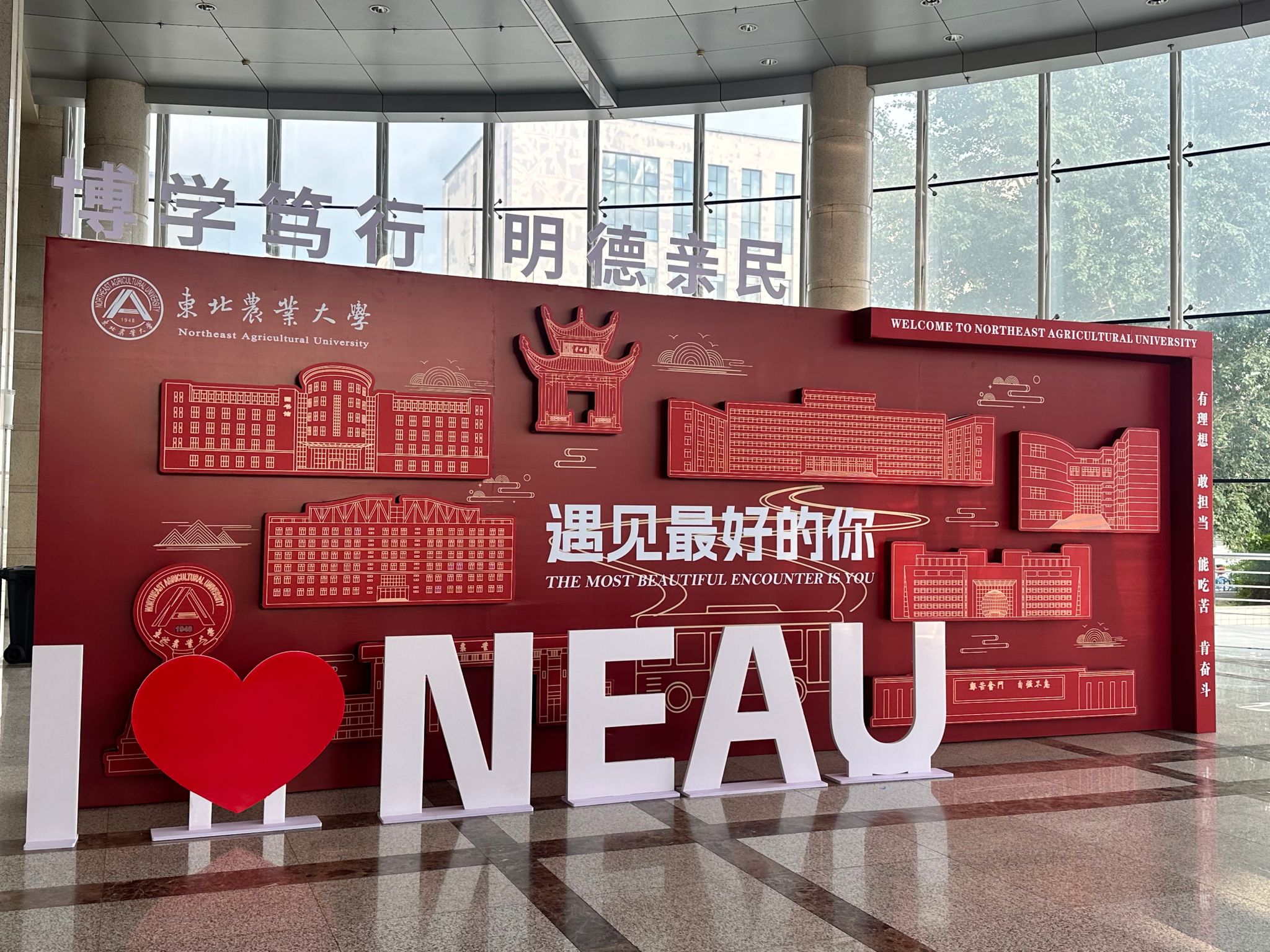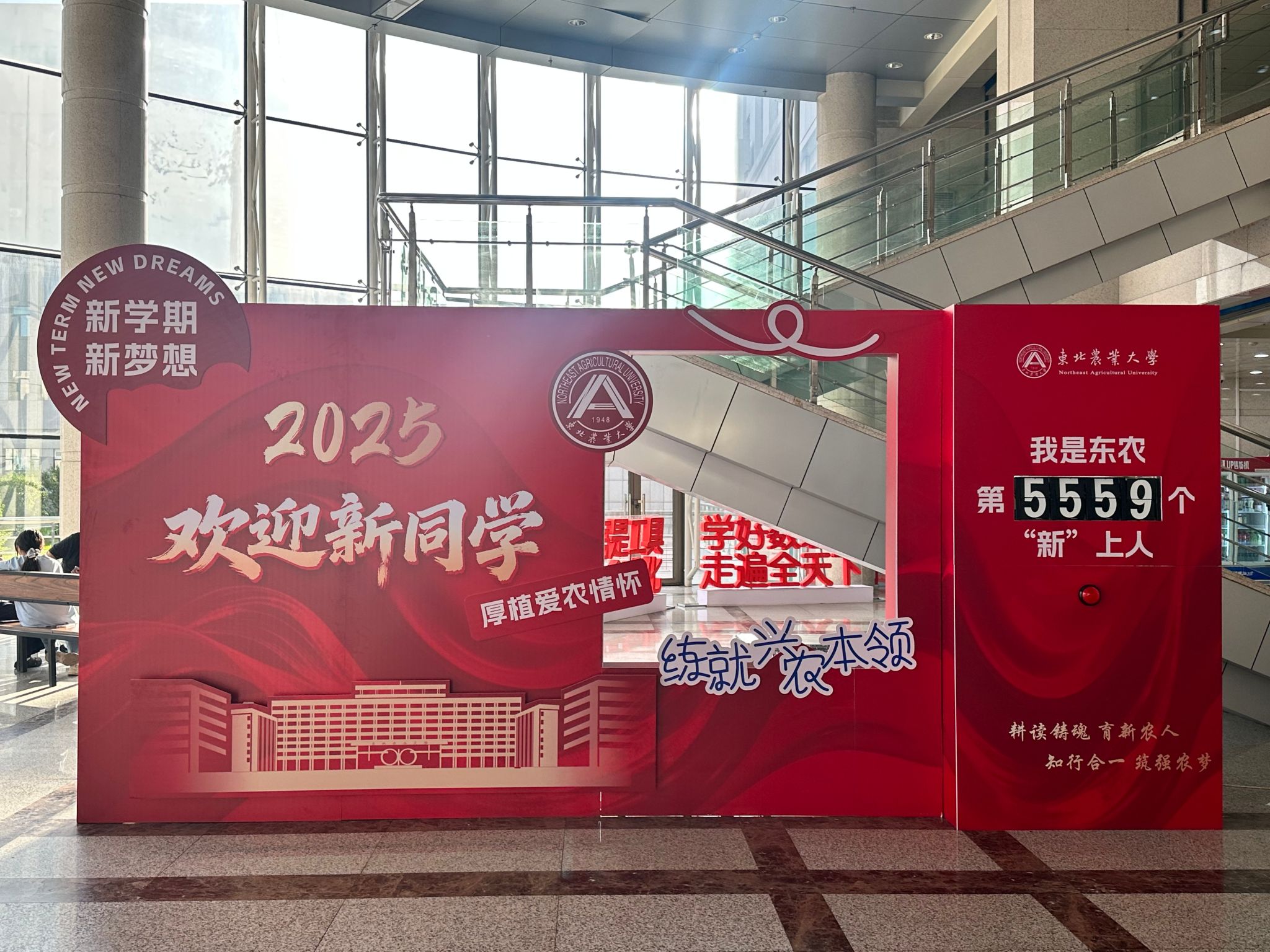 在成栋楼大厅的右侧,我是东农“新”上人的拍照打卡墙,随着红色按钮的按下与弹起,计数器上的数字不停跃动,标志着又一名青年成为东农学子。学校标志性建筑浮雕展示墙上“有理想 敢担当 能吃苦 肯奋斗”的标语,激励新生们要厚植爱农情怀、练就兴农本领,做“博学笃行 明德亲民”的东农传人。