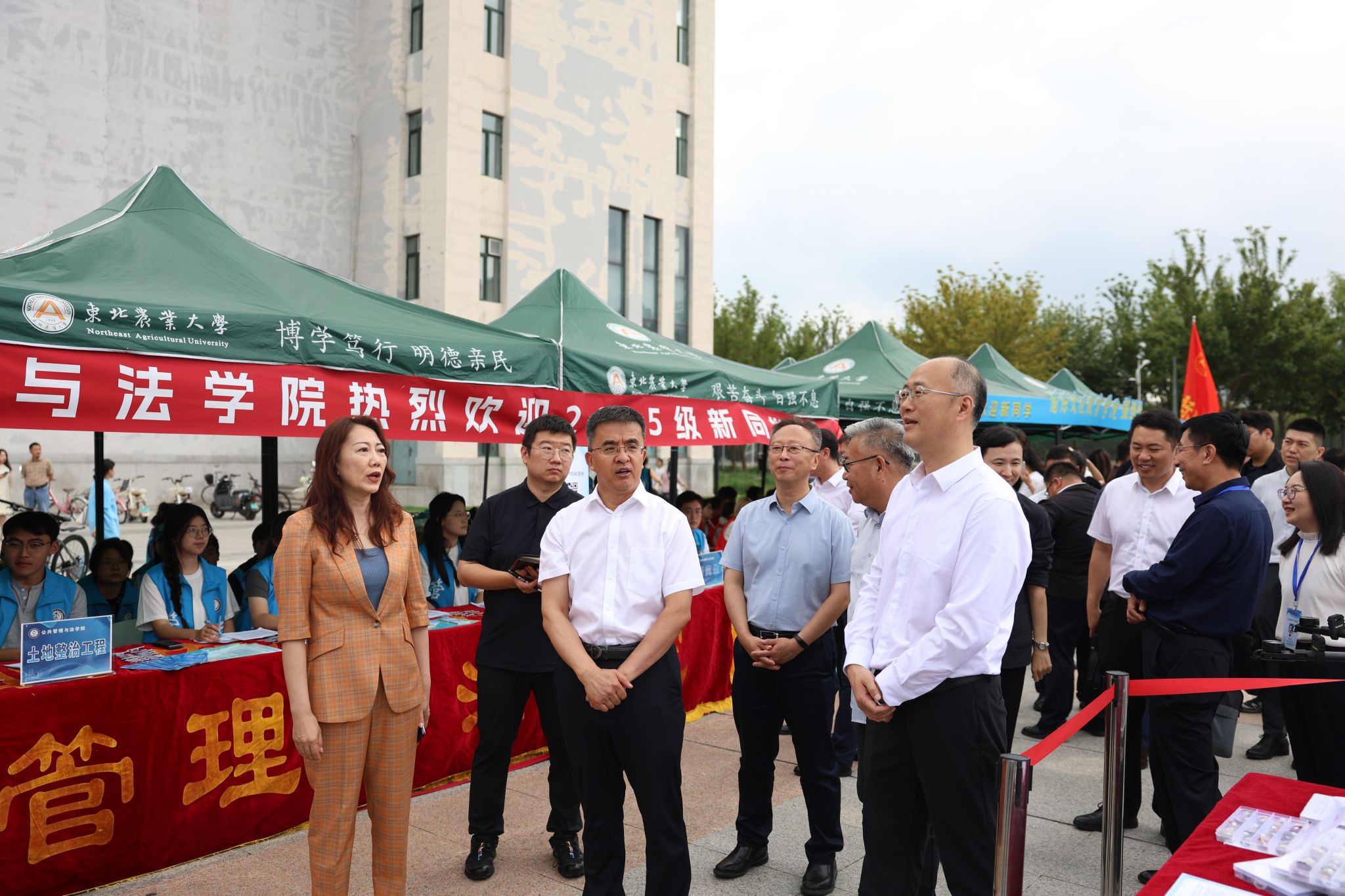 成栋楼南广场是今年迎新主会场。“你是东农人吗?”“你爱东农吗?”“你愿意东农好吗?”掷地有声的爱校三问成为了各学院不约而同的迎新主题。付强一行依次来到各学院迎新接待点,听取迎新工作准备、各专业招生录取、专业发展及人才建设情况介绍。付强一行重点了解新生班主任的选配工作,并指出新生正处于人生的拔节孕穗期,班主任要充分认识到肩负的责任与使命,帮助学生扣好“人生第一粒扣子”,在坚定理想信念、学习习惯养成和学术能力培养等方面积极发挥作用,培养更多堪当时代重任的优秀人才。校领导对新生“绿色通道”、大学生征兵工作站、新疆籍少数民族学生事务服务站、校团委迎新工作站、大学生记者团宣传服务站、科学技术处“智慧农业·科技赋能未来农业”科普展示区等进行了走访,勉励大家要做好迎新服务保障工作,营造积极向上校园文化氛围,提升环境育人成效,展现农业科技发展新趋势,塑造东农人良好形象,让每一位新生感受到东农这个“新家”的温暖。