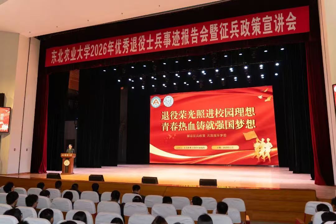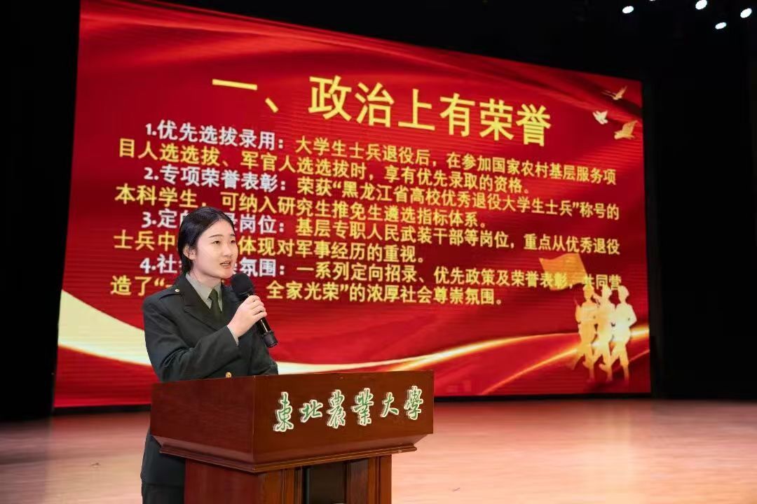为深入宣传国家征兵政策,扎实做好大学生征兵工作,引导和鼓励我校学生积极投身军营、建功立业,11月24日,我校在音乐厅剧场举行2026年征兵政策宣讲会暨优秀退役大学生事迹报告会,香坊区人武部民兵训练基地负责人徐忠海,我校学生工作部(学生处、武装部)部(处)长汪志君、副部(处)长刘双奇,校参军预备队指导教师张海军等出席活动,各学院本科、研究生毕业班辅导员及全校有参军意愿的学生参加活动。
