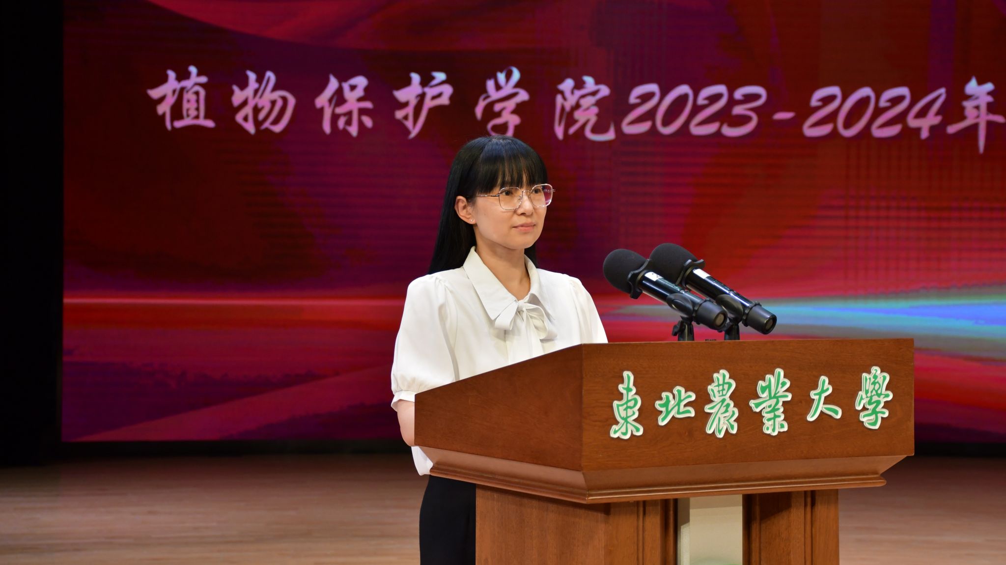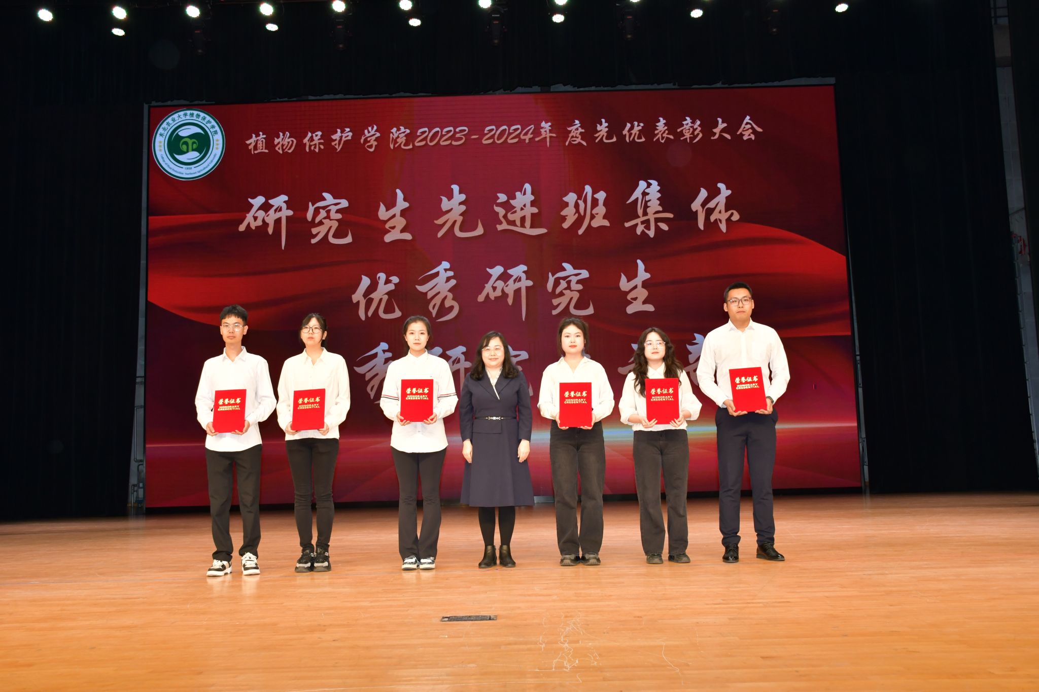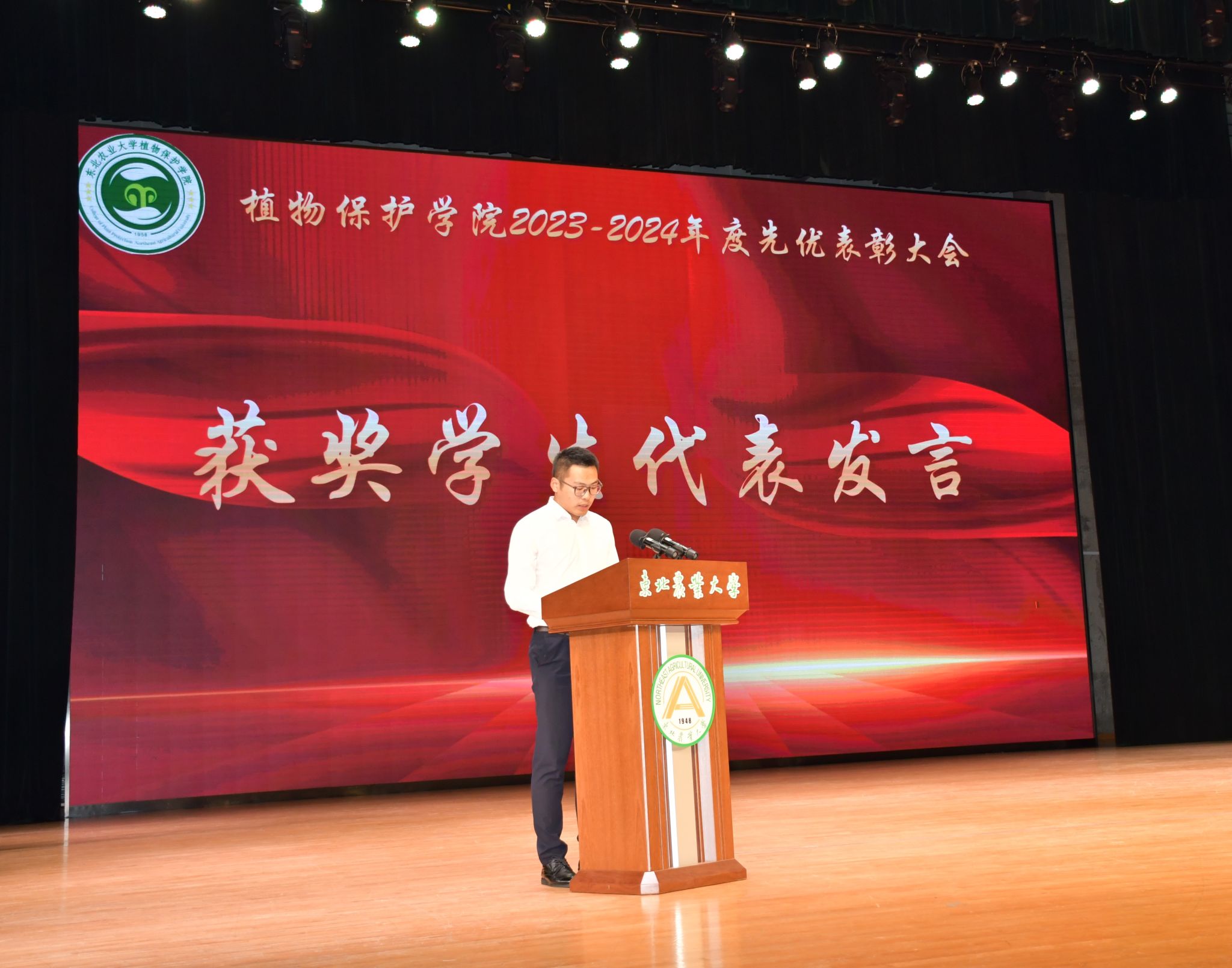 植物保护学院副处级辅导员张贺宣读《关于表彰2023—2024学年度研究生先进班集体、优秀研究生、优秀研究生干部的决定》,并为获奖学生颁奖。