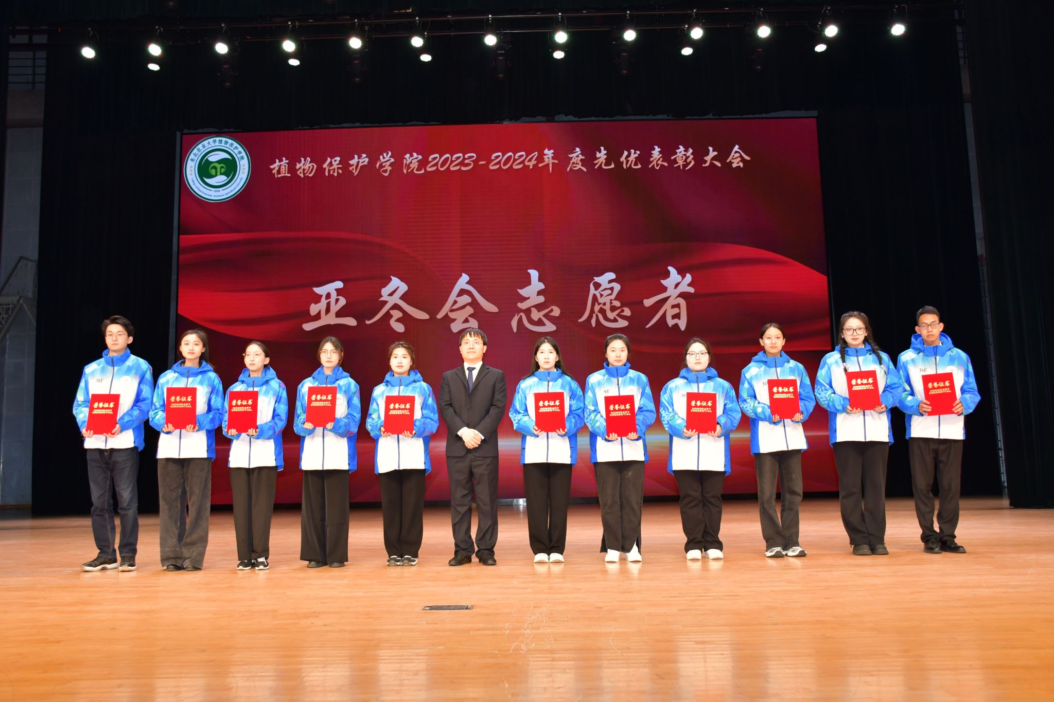 植物保护学院农业昆虫系主任谢桐音宣读《关于嘉许表扬亚冬会高校师生志愿者的通报》,并为获奖学生颁奖。