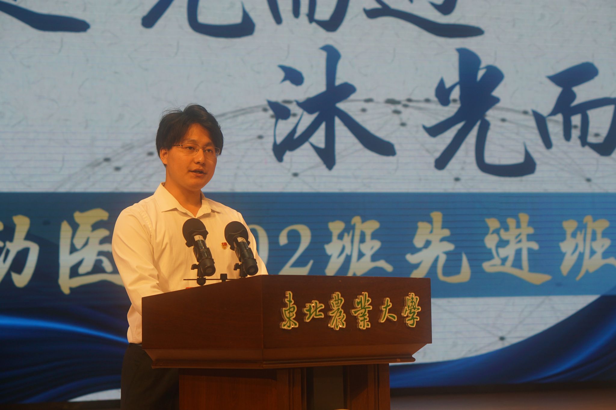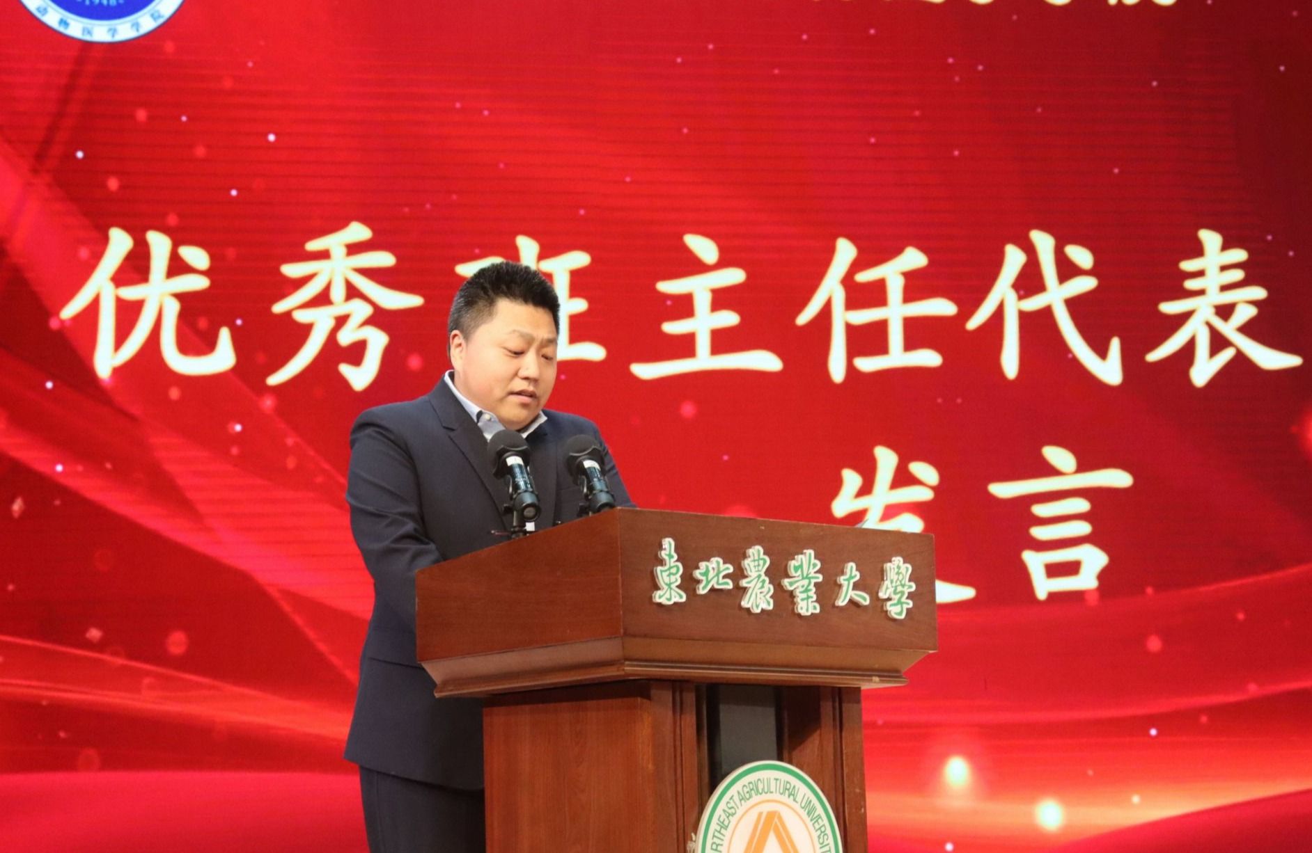 动医2103班班主任吴志勇代表优秀班主任发言。他表示,班主任要立足动物医学专业特色,通过个性化职业规划指导,助力学生明晰深造、科研及行业发展路径,未来将持续以“四有”好老师标准要求自身,为培养新时代兽医领军人才贡献力量。