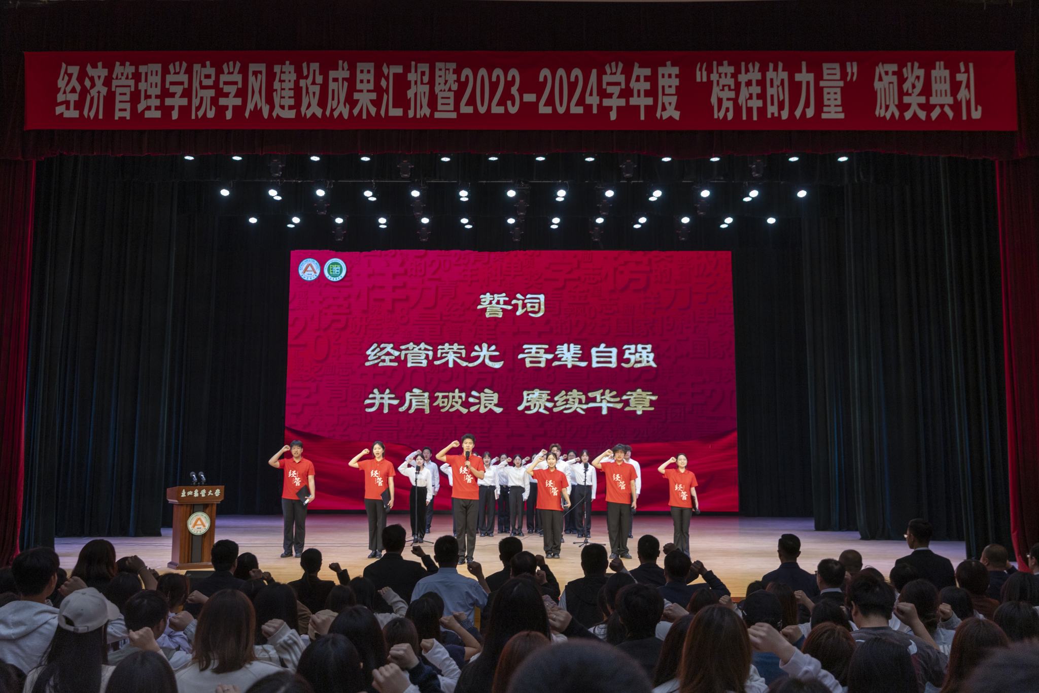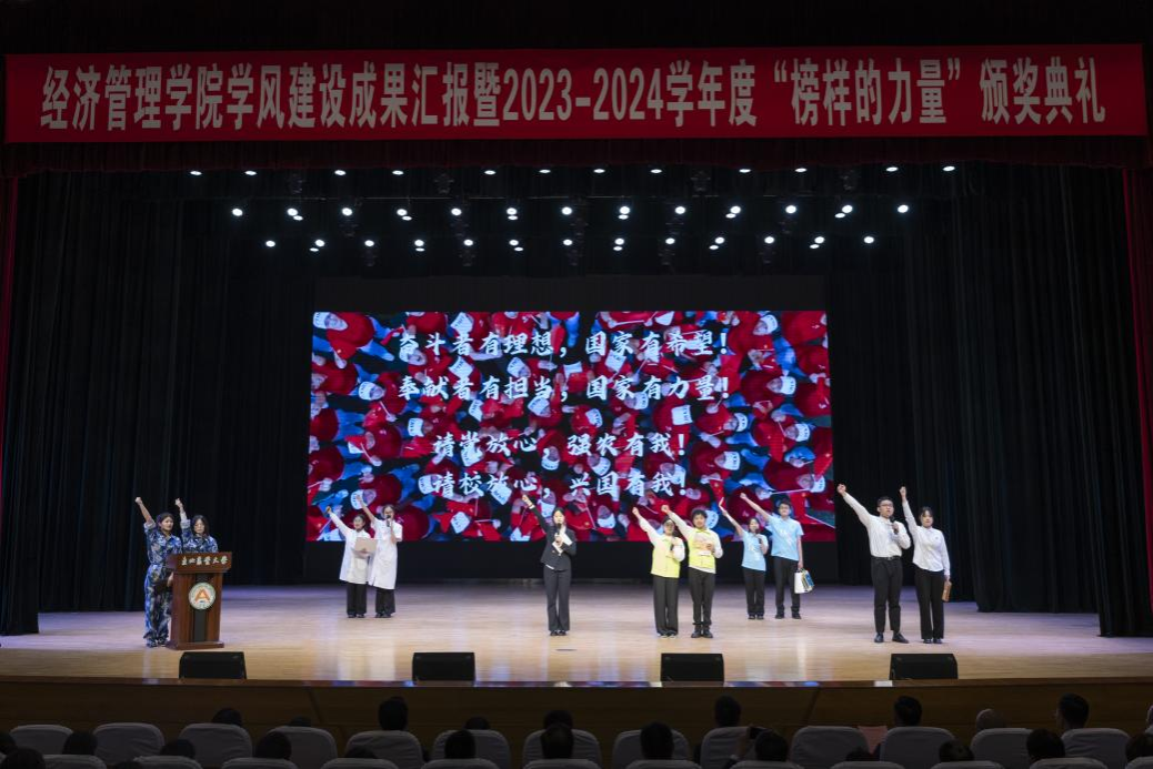 颁奖典礼在诗朗诵《榜样之光》中落下帷幕。据悉,经济管理学院把学风建设作为推动学生工作高质量开展的重要任务、作为促进学生全面成长成才的重要保证。打造学生班级、寝室、党支部、石榴籽“耕读·同心”民族团结学习互助示范站等学风建设阵地,构建“寝室网格化育人单元”,创设“菁英计划”训练营,启动了“经管圆桌派”系列座谈,举办七期《经管青年说》优秀学子事迹报告会,创设了“爱玛·经管”菁英班,营造了见贤思齐、比学赶超的学风建设氛围,形成了一批深受学生喜爱、有影响力的学风建设工作品牌。下一步,学院将以此次颁奖典礼为契机,持续总结学风建设经验,不断探索学风建设新模式,引领青年学生追逐榜样之光,汲取奋进力量,在伟大时代中展现青春风采、书写时代华章。