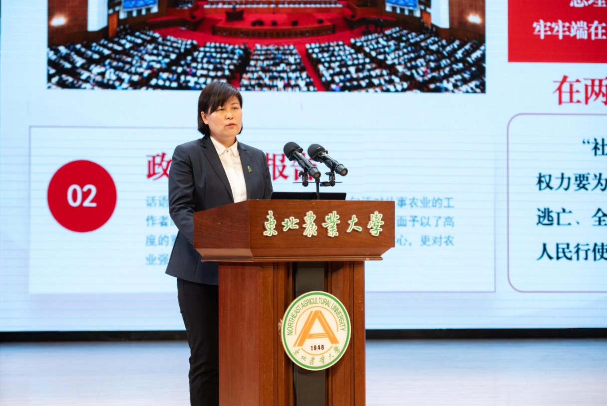 报告会上,于家傲分享了作为正式代表参加全国人民代表大会的五点感受,一是感受到中国人民成为自己命运的主人;二是人民有信心,国家才有未来,国家才有力量;三是人大代表为人民,书写履职答卷;四是最强音培育新质生产力;五是巾帼筑梦出彩人生。于家傲从全国两会看农业发展,具体阐释了农垦的沿革、功能定位、北大荒发展及建设,讲述了龙江构建新质生产力背景下不断筑牢大基地根基、构建大企业格局、布局大产业体系的故事,她以北大荒集团宝泉岭分公司作为典型案例展现了“三大一航母”的宏伟蓝图,激励广大学子锚定农业强国建设目标,书写乡村振兴东农答卷。
