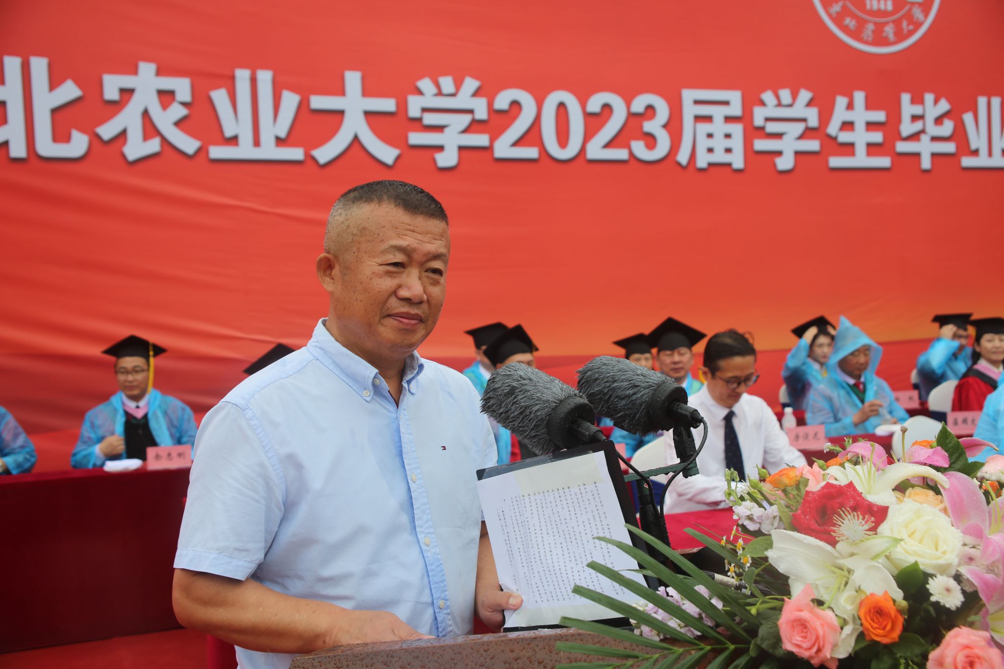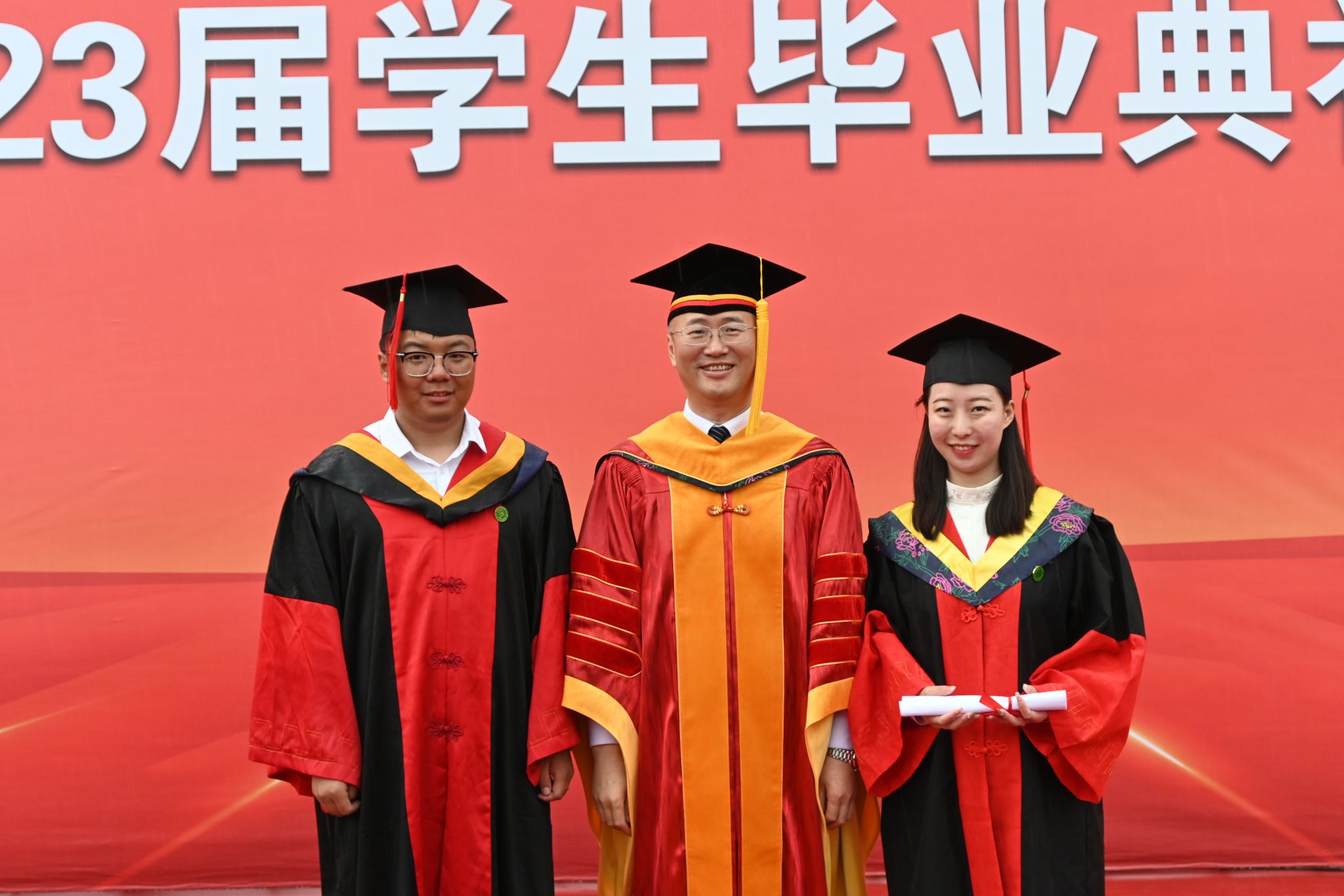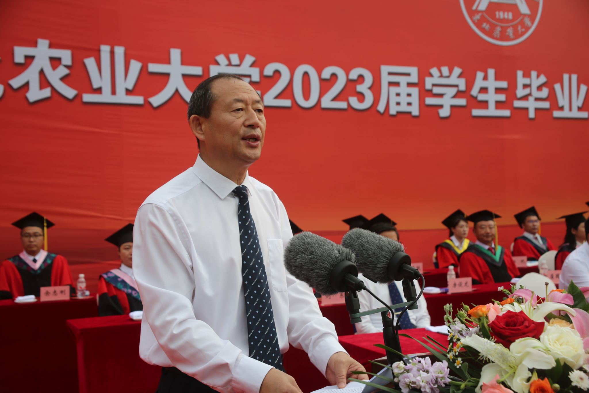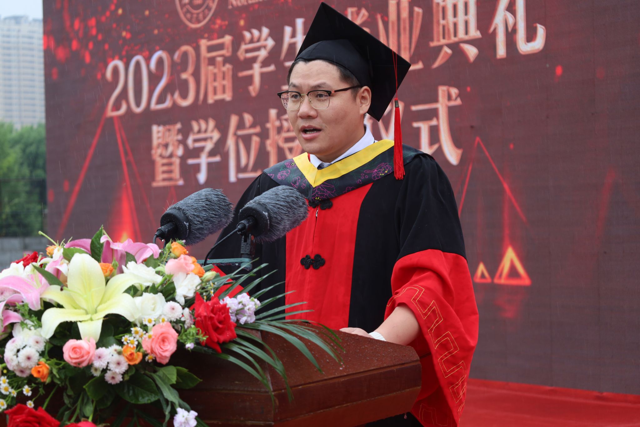 王泽方在主持中表示,从新中国成立70周年到建党100周年,从“五四运动”100周年到建团100周年,从打赢脱贫攻坚战到党的二十大胜利召开,从疫情开始到恢复常态,2023届毕业生成长的每一步,都与时代如此贴近。你们秉承“博学笃行、明德亲民”的校训,收获知识,砥砺品行,成熟心智,提升能力,交出了一份优异的毕业答卷。今天,你们就要满怀豪情、出征四方,做人生与时代的答卷人。希望你们按照习近平总书记重要讲话精神要求,做新时代进步青年,做矢志报国、追求卓越的东农人,在实现中华民族伟大复兴的征程上贡献东农力量。