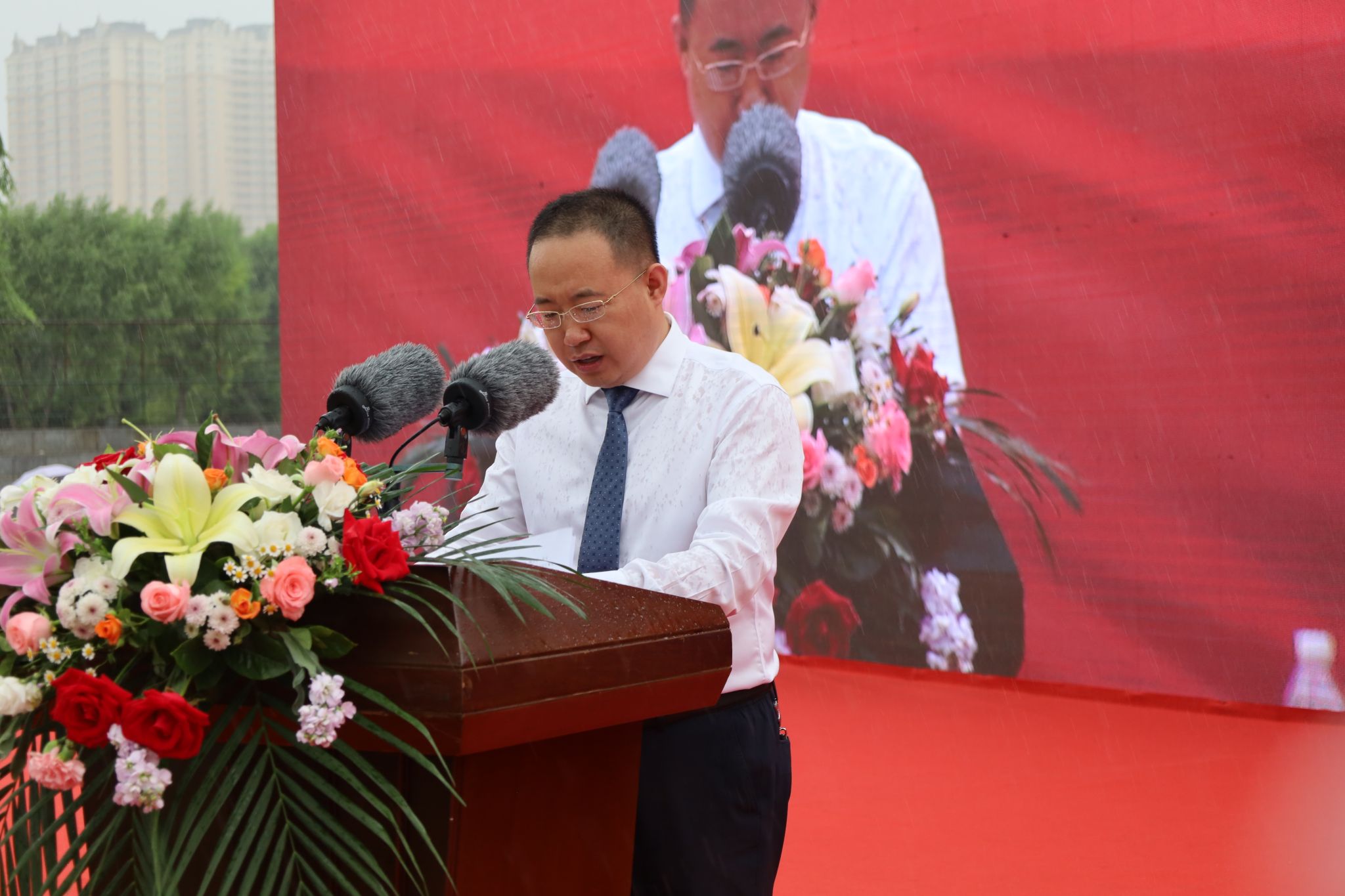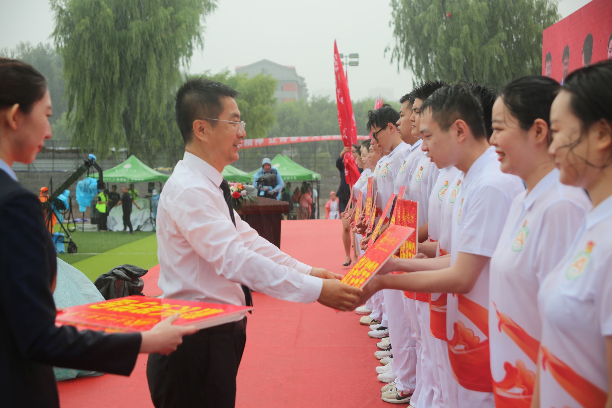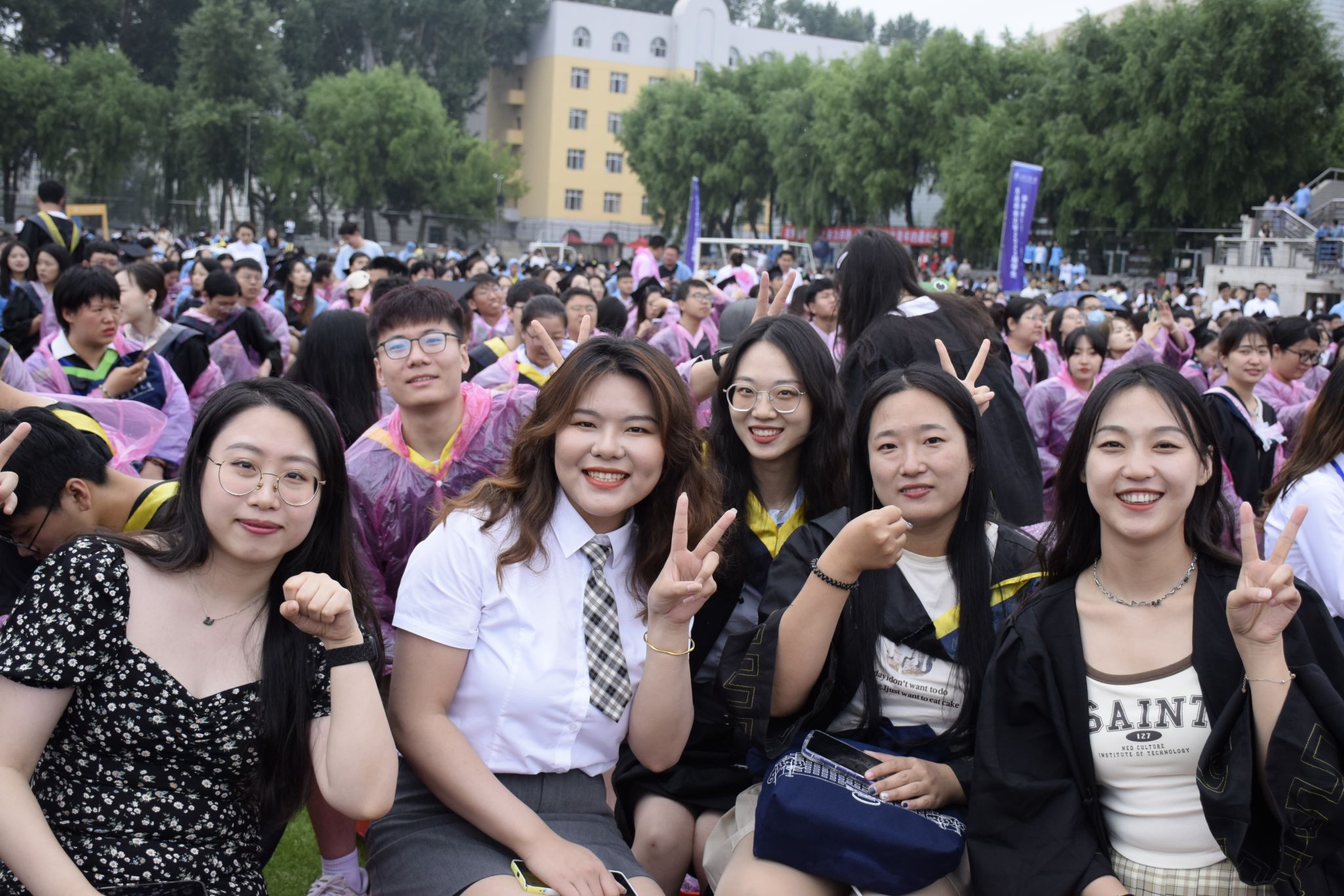 典礼过半,阵雨突如其来,全体参会校领导风雨无阻地为毕业生们送上祝福,同学们穿上学校提前备好的雨衣,全神贯注的聆听、观礼,秩序井然的领奖、发言,展现了毕业生与母校风雨同舟、同心同行的坚定守护与双向奔赴。这场阵雨成为学生毕业前接受的一次特殊“洗礼”,师生共上的一堂特别的毕业大课。