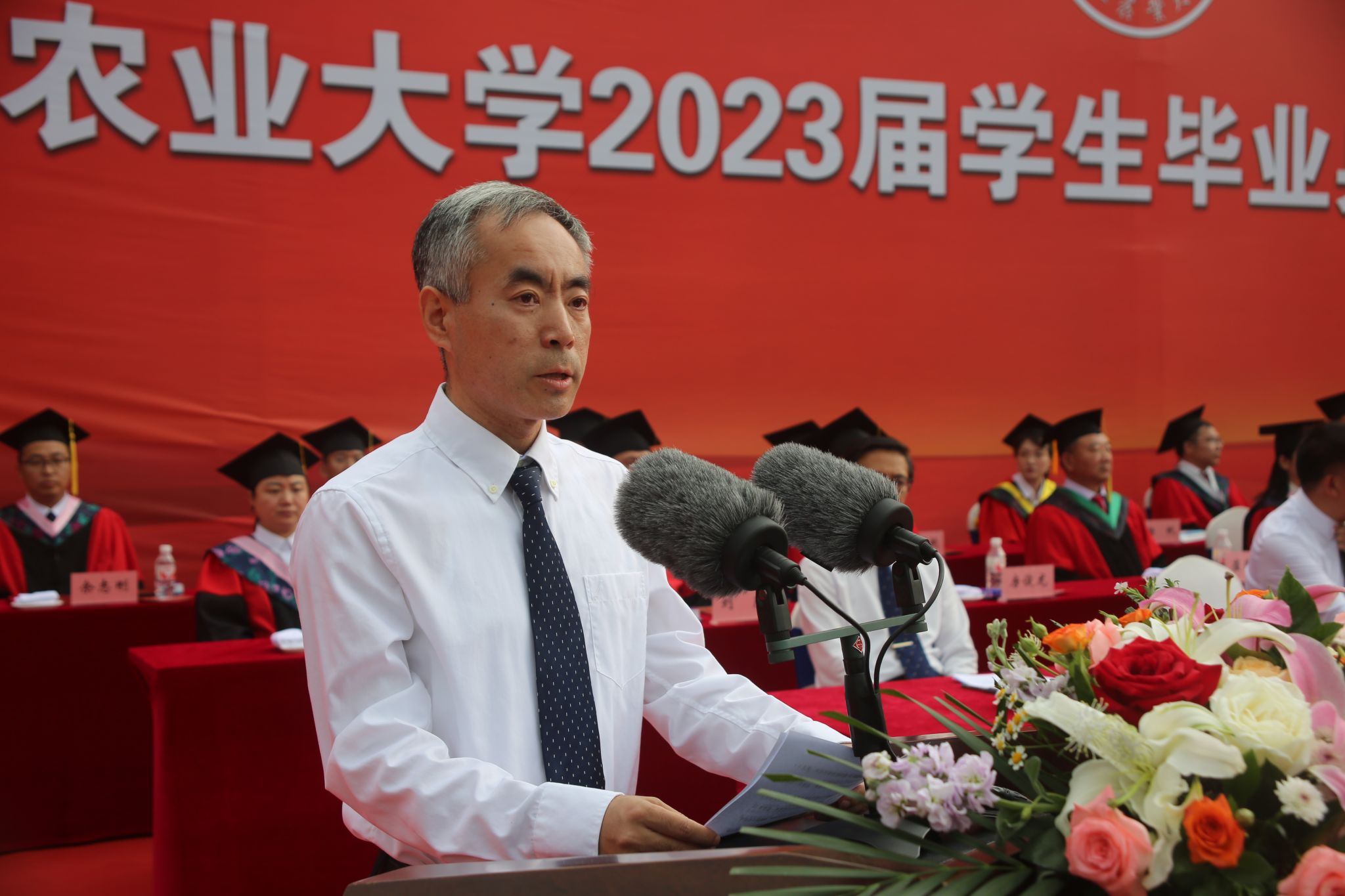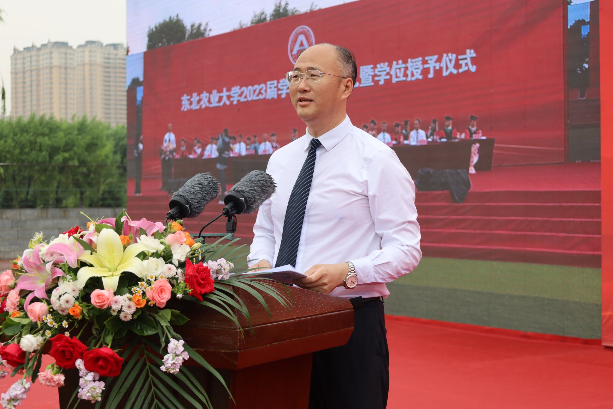 在热烈的掌声中,付强作了题为《坚定东农自信不负时代重托》的讲话。4000余名毕业生代表共同聆听大学时光的“最后一课”。他深情地对毕业生说,“不经历风雨,怎能见彩虹!大自然给2023届毕业生上了最后一课,祝贺全体2023届毕业生以优异的表现给自己、给母校上交了一份满意的答卷!”付强回顾了2023届毕业生与东农同成长、共奋进的难忘时光,并作为校长、师长和学长,给毕业生提出三点希望:一是坚定东农自信,厚植家国情怀,志在星辰大海。胸怀“国之大者”,将个人发展融入国家发展中,为加快实现高水平科技自立自强、扎实推进农业农村现代化建设、不断实现人民对美好生活的向往、全面建设社会主义现代化国家,贡献新时代东农人的智慧和力量。二是坚定东农自信,砥砺强农之志,不负伟大时代。以学识为底蕴,以才气做锋芒,主动担负起建设农业强国、科技强国的历史使命和社会责任,保持锐意进取、永不懈怠的精神状态,争当新时代的实干家、奋斗者、领跑者,在不懈奋斗中展现新时代东农人的新风采。三坚定东农自信,锤炼素质品格,书写绚烂人生。保持终身学习的习惯,持续提升自身的综合素质,在人生的旅途中少一点抱怨,多一些努力和勤奋;少一点自卑,多一些自信和坚强;少想一点自己,多想一些他人,学会“海纳百川”般的包容,学会“壁立千仞”般的刚强,找准人生定位,担当新使命,展现新作为,用奋进之笔谱写新时代东农人的青春之歌。
