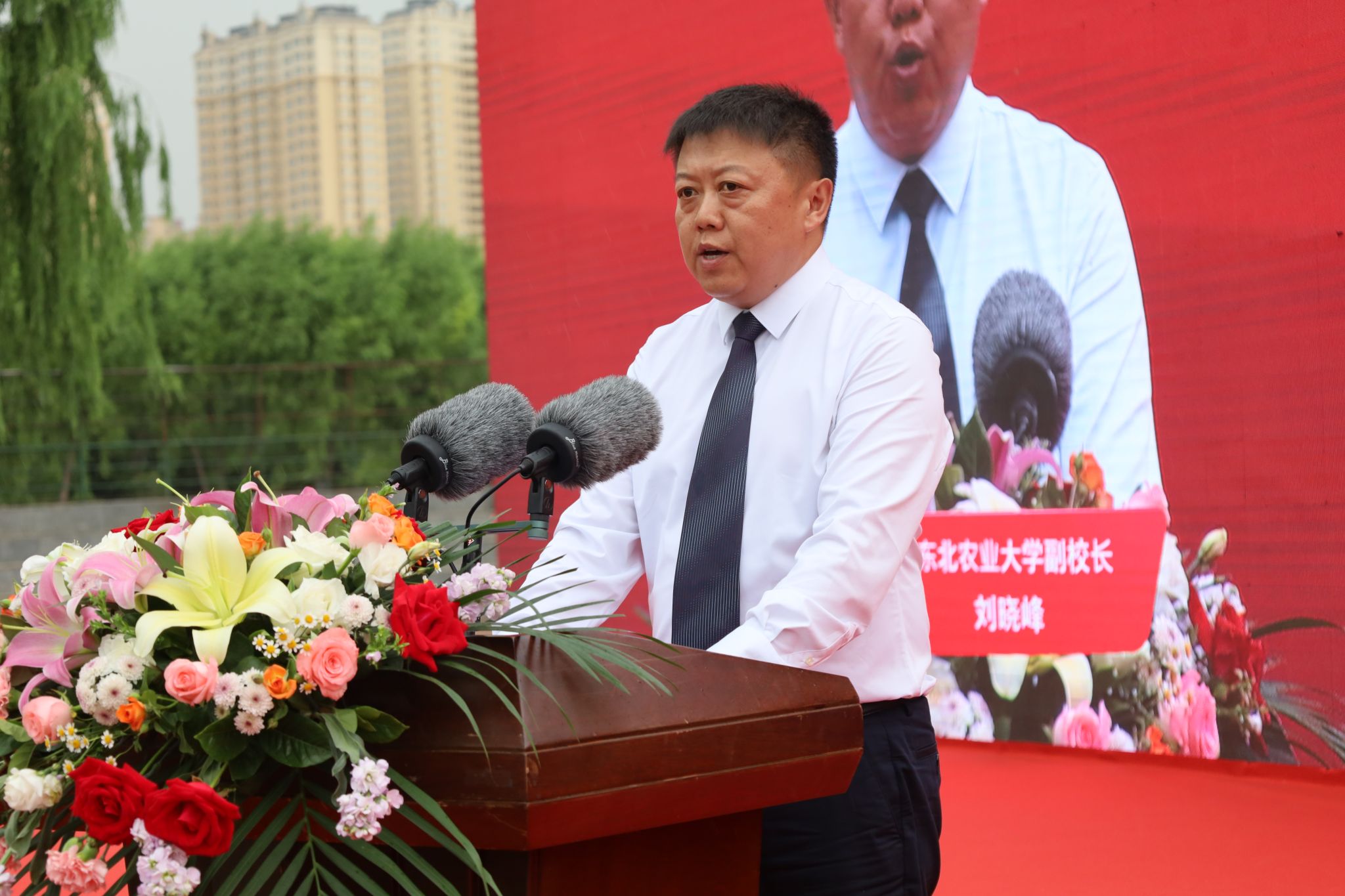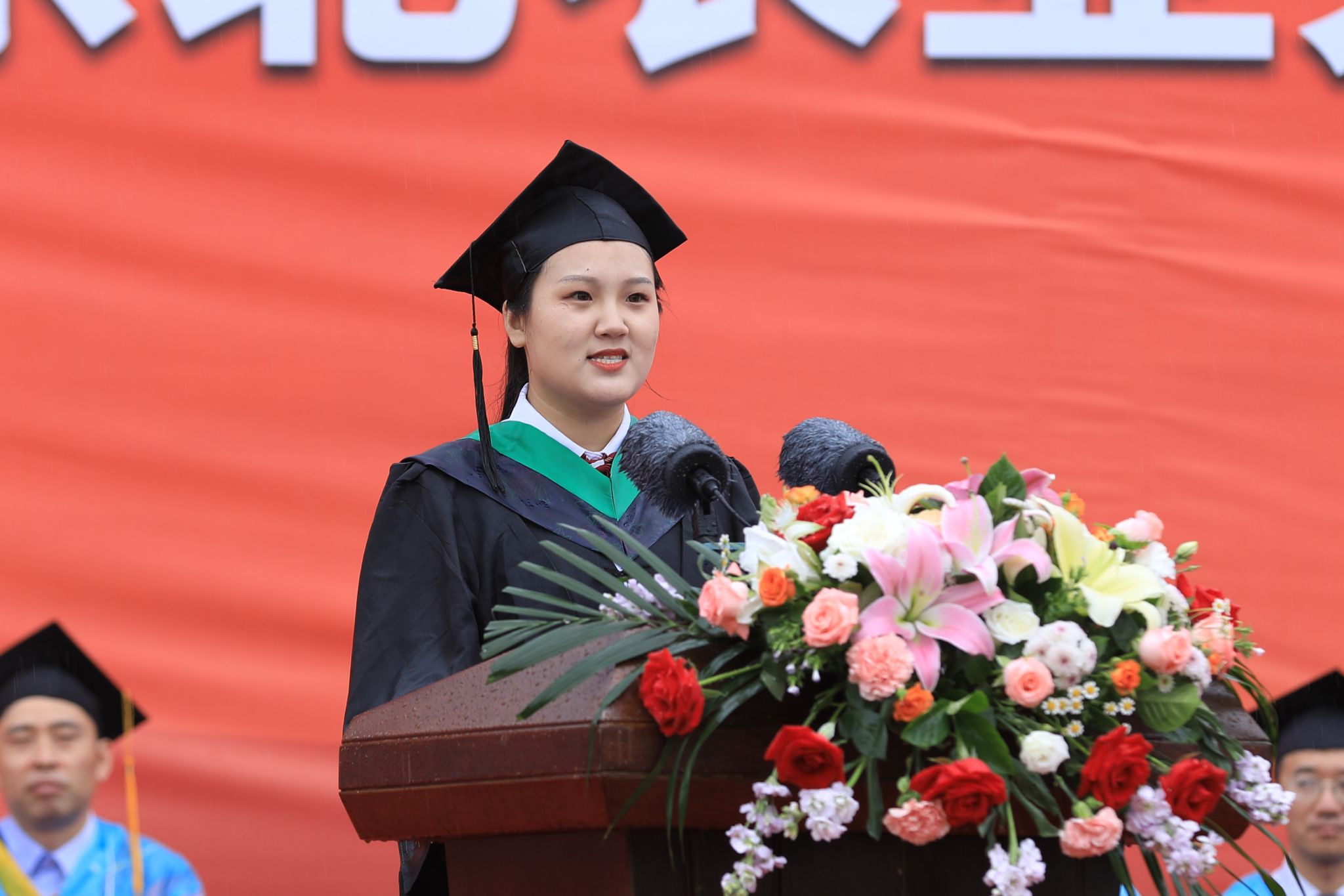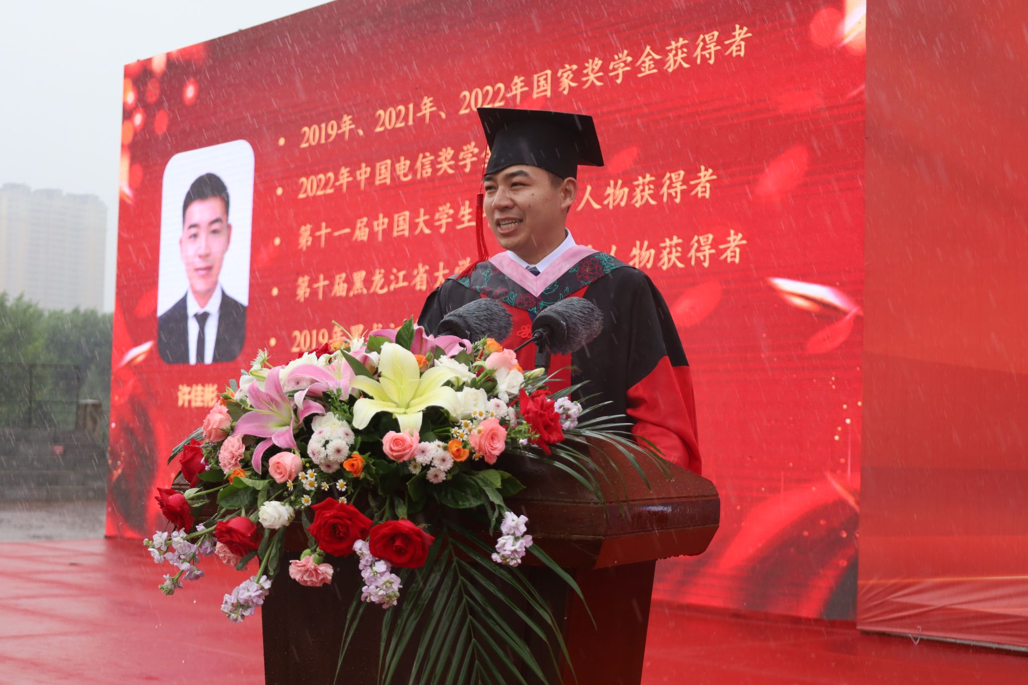 毕业研究生代表、经济管理学院2020级农业经济管理专业博士研究生许佳彬,毕业本科生代表、资源与环境学院2019级农业资源与环境专业于海洋在典礼上发言。他们深情回顾了大学期间的每个精彩瞬间,表示是母校的培养、师长的相助、同窗的支持坚定了他们扎根龙江沃土,服务乡村振兴,为龙江的发展与建设贡献“东农人”智慧和力量的无悔选择。作为东农学子,一定不忘东农情、践行东农梦、赓续东农魂,以豁达的胸怀容纳潮起与潮落,以淡定的心态直面泥泞与坎坷,坚守梦想与选择,绽放属于东农人的光彩。