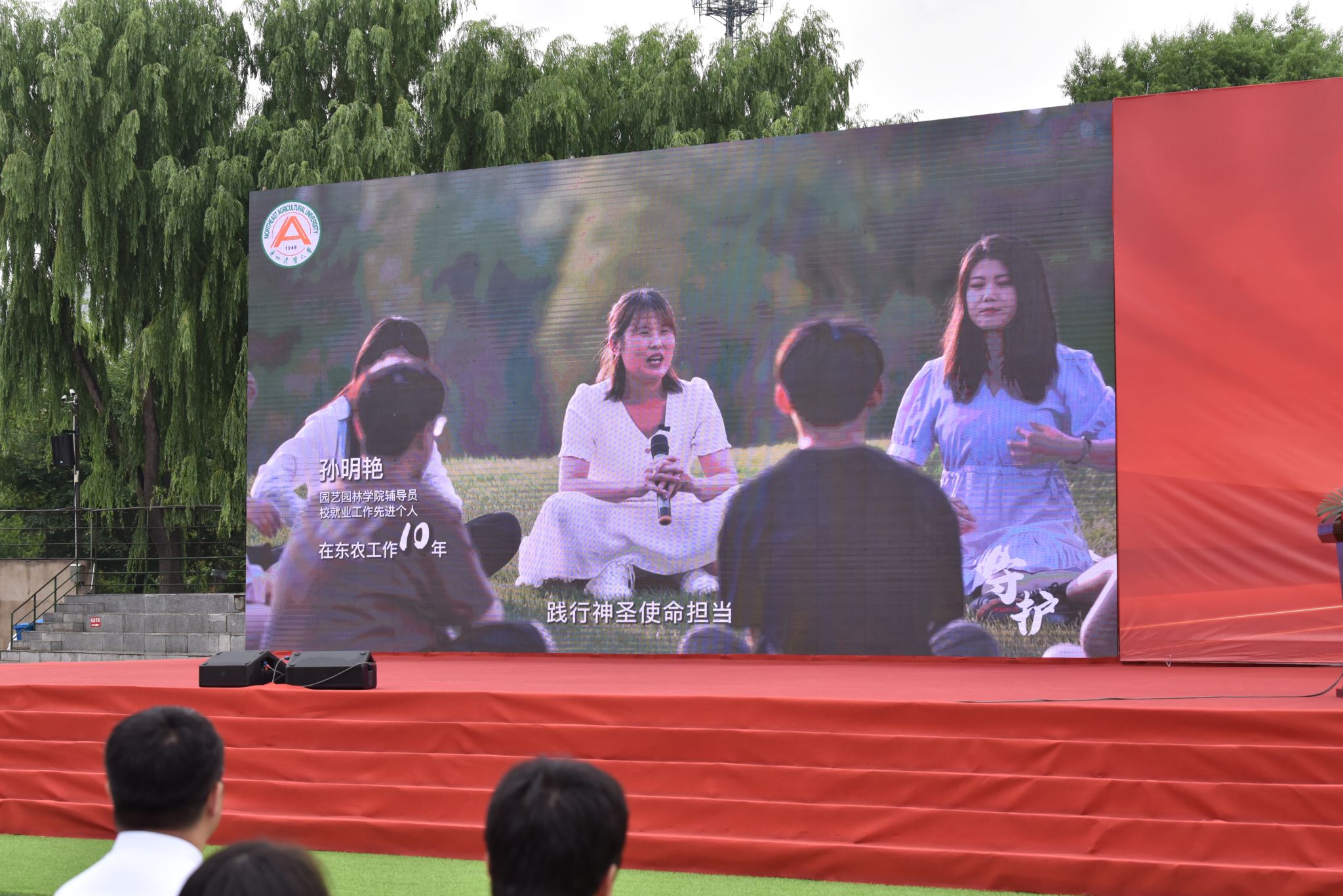 山水一程,守望相助。与会师生共同观看学生工作部制作的专题视频《守护》,视频从校园生活的点滴瞬间出发,记录了学校教职员工对学生的全情守护和深情陪伴,东农教师用责任与担当谱写了立德树人的华彩篇章。研究生导师姜毓君、王傲雪、李金龙,公共基础课教师焦扬、高延宏,思政课教师韩雪,体育部武术队主教练董超武,艺术学院教师郭惠玲,图书馆借阅部主任李紫健,校医院副院长曹郁秋,饮食服务中心饺子园经理边道纯、校园绿化管理中心主任夏福民、学生公寓管理中心管理员赵静、保卫处消防科刘浩东,辅导员代表刘丹、杨森森、孙明艳等17名教职工代表上台,毕业生代表向他们表达了诚挚的感谢并献上了饱含祝福的鲜花。
