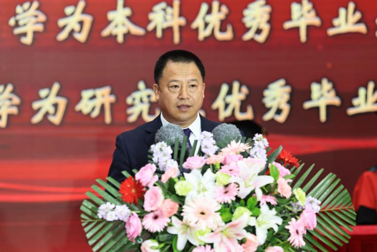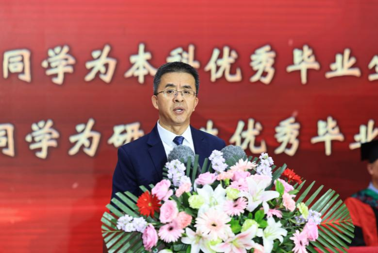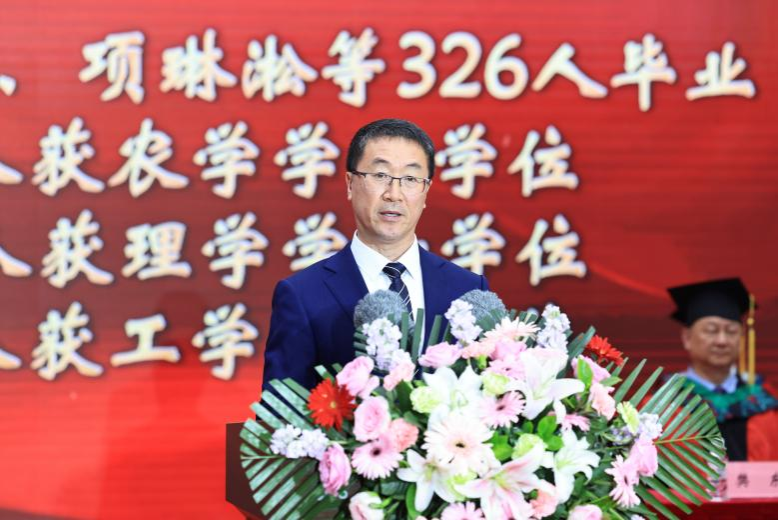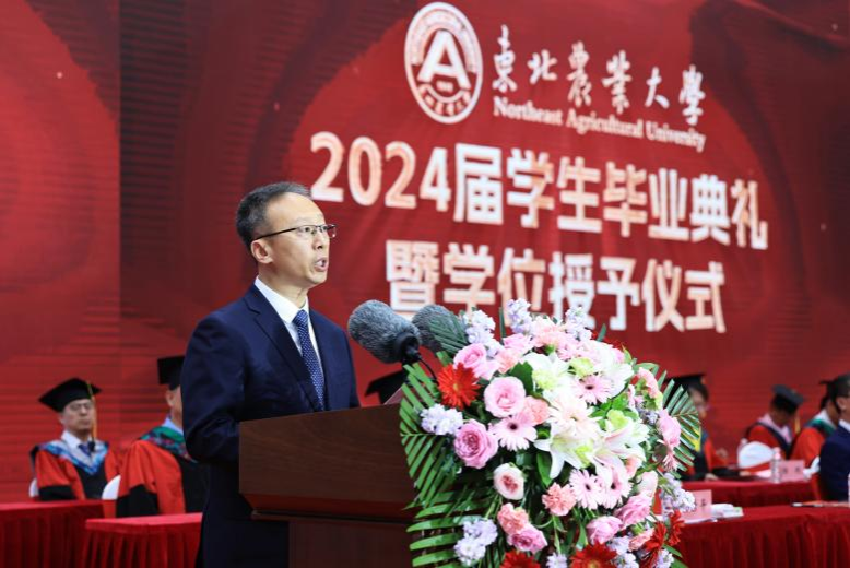 校长付强代表学校,向全体毕业生表示最热烈的祝贺!向爱子情深的家长、甘为人梯的教师、默默奉献的管理服务人员,以及长期以来关心支持学校发展的海内外校友,表示最衷心的感谢和最崇高的敬意。他说,身为“强国一代”的你们,在东农亲眼见证,党和国家事业昂首阔步,迈向崭新发展高度;身为“强校一代”的你们,与东农携手共进,助力学校奋力书写高质量发展新篇章;身为“自强一代”的你们,在东农勇往直前,铭刻成长印记,铸就成才辉煌。