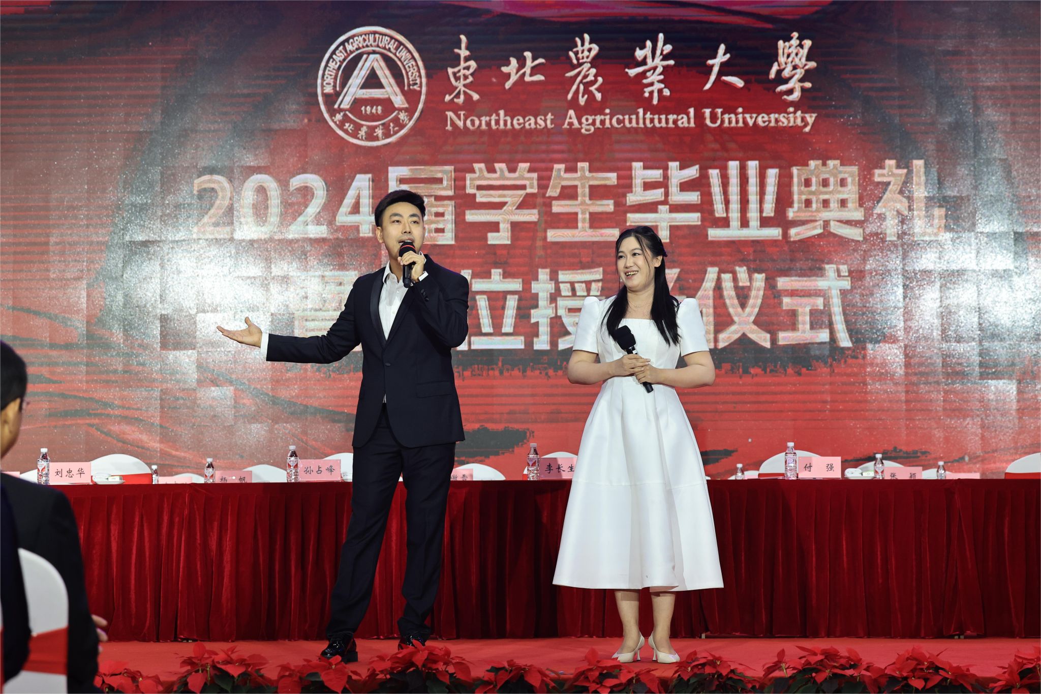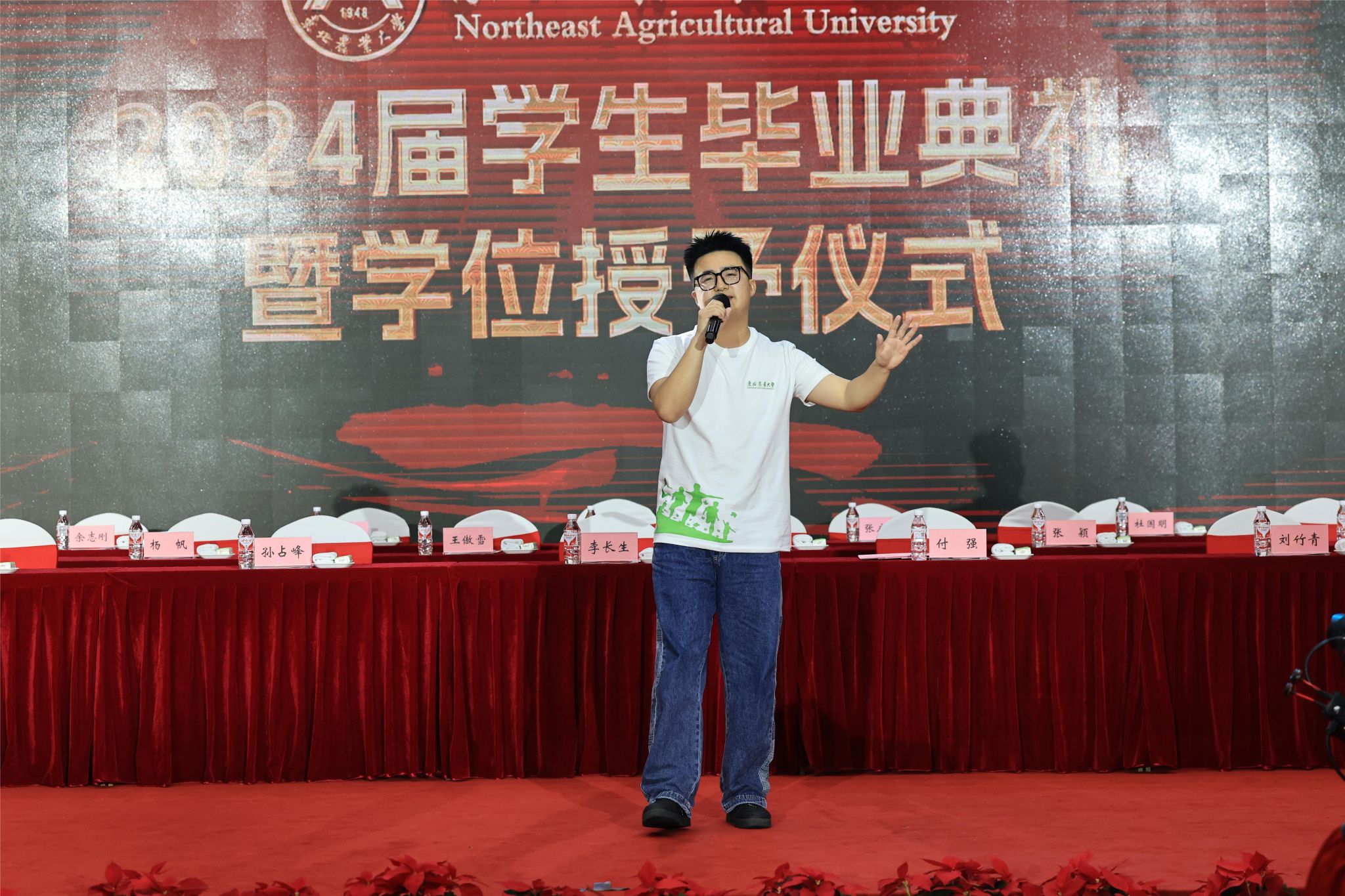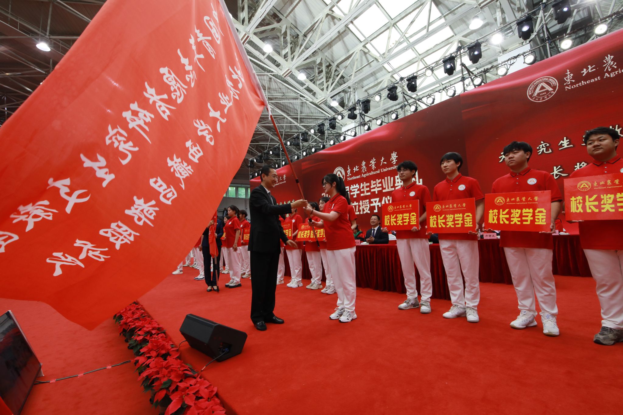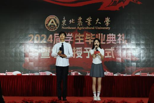 陈庆山宣读《关于表彰东北农业大学2024届优秀毕业生的决定》,校领导向优秀毕业生代表颁发荣誉证书。