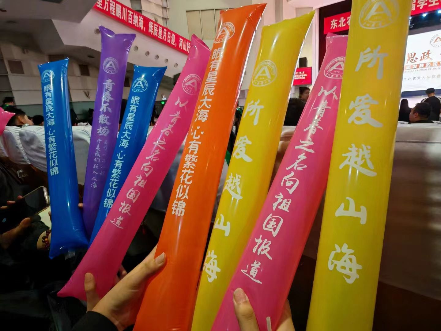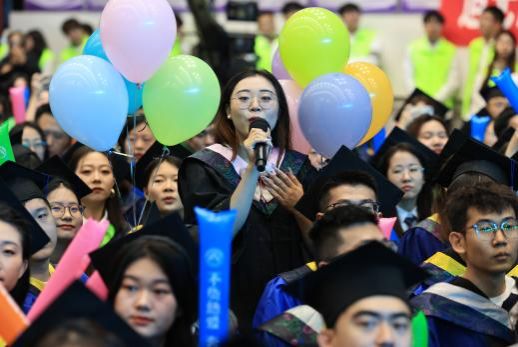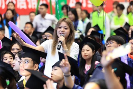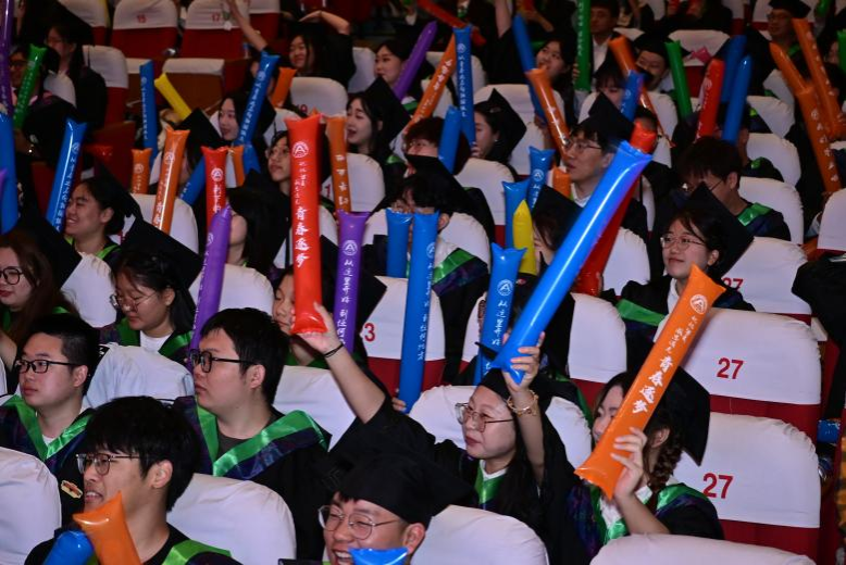飘雨的天空渲染了浓郁的毕业氛围,温馨感人的细节随处可见:“我们毕业啦,青春不散场”“不负热爱,奔赴山海”“感恩母校,感恩遇见”,印在毕业生加油棒上的一句句毕业感言是对过往的回望和感恩,也是对未来的美好期盼与憧憬,飘扬的彩旗、缤纷的气球、充满故事的照片……每一处细节,每一处装饰,都蕴含着学校最真切的期许和最美好的祝福。