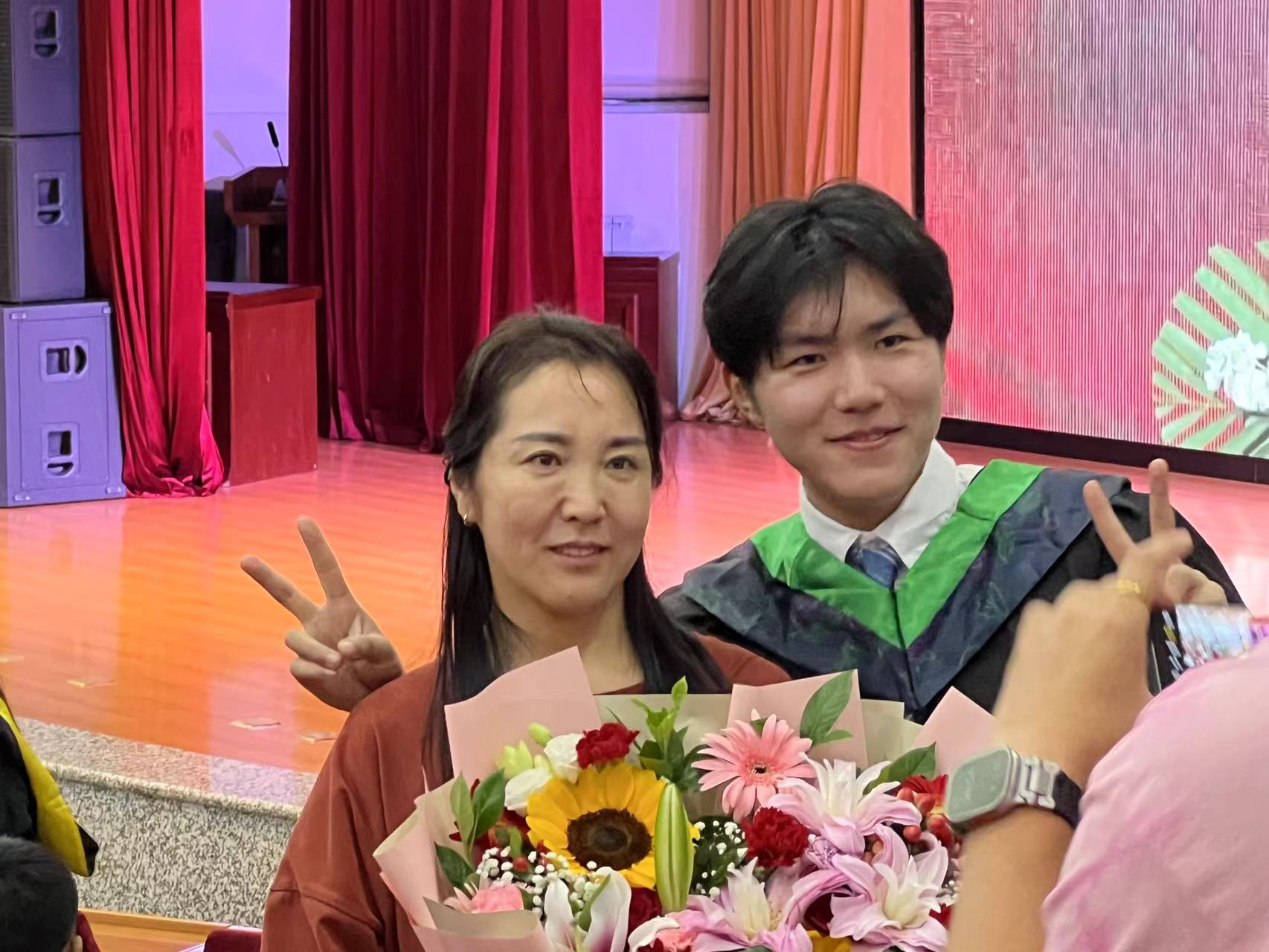 为方便家长观看学位授予仪式,学校在体育馆、音乐厅、图书馆三个会场设立了家长观礼区,为家长代表特别定制了观礼手袋,包括一枝康乃馨、一杯酸奶、一封致家长的信、观礼手册等,还准备了热茶、雨衣、雨伞等用品。毕业典礼结束后开设四辆大巴专车,由各学院志愿者引导家长乘车前往两个学位授予仪式会场观礼。家长观礼区设计了毕业生给家长献花、现场抽奖等环节,让典礼仪式感满满,温情、暖心、有爱的双向奔赴,成为了校园此刻最美的风景。