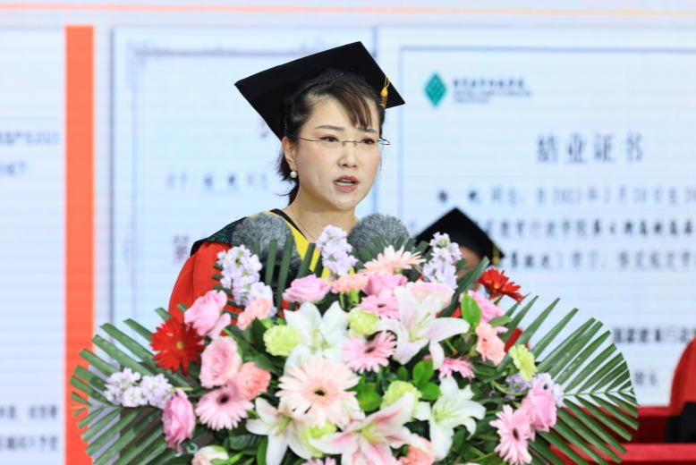 教师代表、国家重大人才工程特聘教授、水利与土木工程学院教授杨帆发言。她希望毕业生们能够始终保持对知识的渴望和对学习的热情、始终保持一颗谦虚谨慎的心、始终保持积极向上的态度,在未来的日子里,脚踏实地、积少成多,追逐最耀眼的光芒,征服最险峻的高峰,走向更广阔的未来!