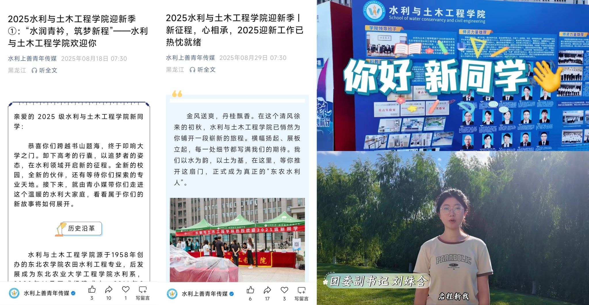 学院积极把握新生入学前的“前置教育”契机,依托“水利上善青年传媒”微信平台推出“2025水利与土木工程学院迎新季”专栏,持续发布校史院情、安全须知、校园生活指南及报到流程等实用信息,并精心制作“声声相传,以行助新”迎新主题视频,以“早介入、全覆盖、重实效”为原则,助力新生提前融入大学环境、完成角色转变。同时,通过今日校园APP、迎新工作群等渠道,学院全面摸排新生基本情况,精准识别各类需求,针对性推送学校政策与专业发展动态,为新生入学及后续学习奠定基础。此外,新生辅导员郭明军、张鹏伟组织召开线上见面会,详细介绍报到准备事项、迎新安排及入学教育计划,并向新生及家长发出“爱校三问”倡议,有效增强新生的归属感和认同感,为迎接新生入学做足准备。