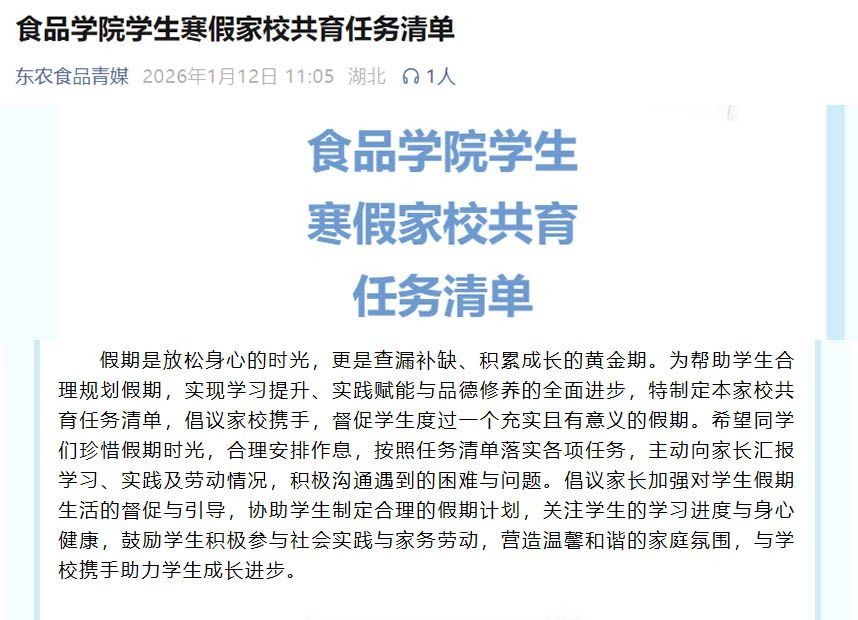 为深入贯彻落实立德树人根本任务,按照学校《“暖冬护苗”行动的通知》要求,食品学院在寒假紧扣学生教育管理服务核心需求,以精准家访、深度辅导、特色育人为核心抓手,创新工作模式、细化落实举措,扎实推进各项工作落地见效,筑牢家校协同育人防线。