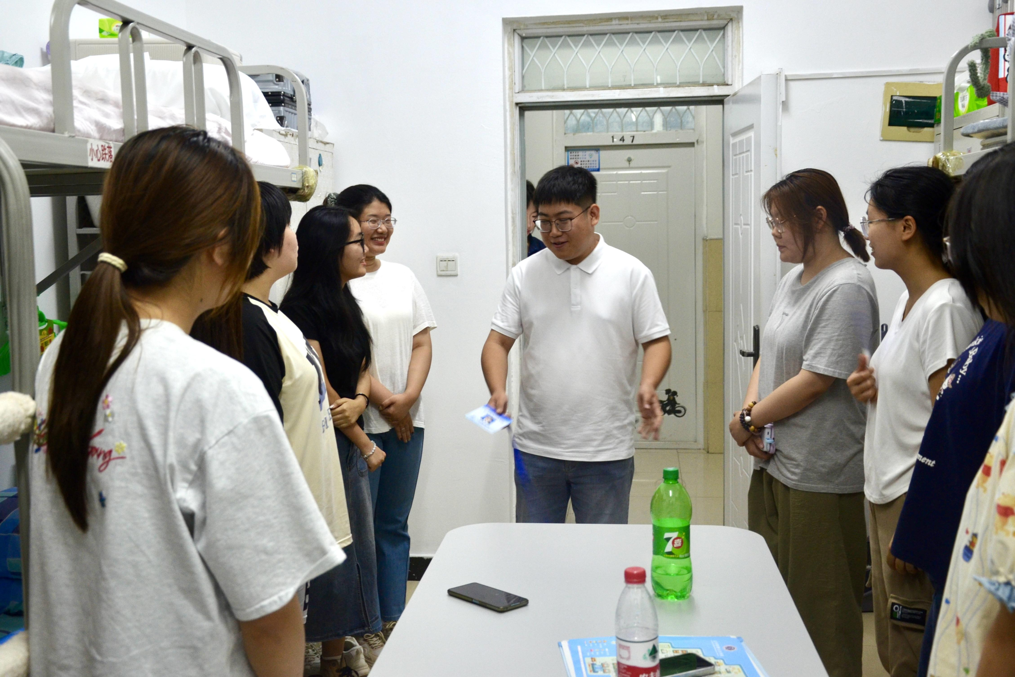学院开展“暖心走访”活动,新生辅导员张闯深入宿舍检查水电安全,叮嘱新生防诈要点,并提出学习生活建议。