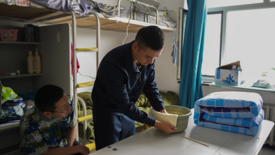 下午,各连教官深入新生宿舍,规范内务标准。一掐一捏,自成方正,一展一铺,大有讲究。教官们一丝不苟,尽职尽责,细心教导,把部队的优良传统发散到新生中去。